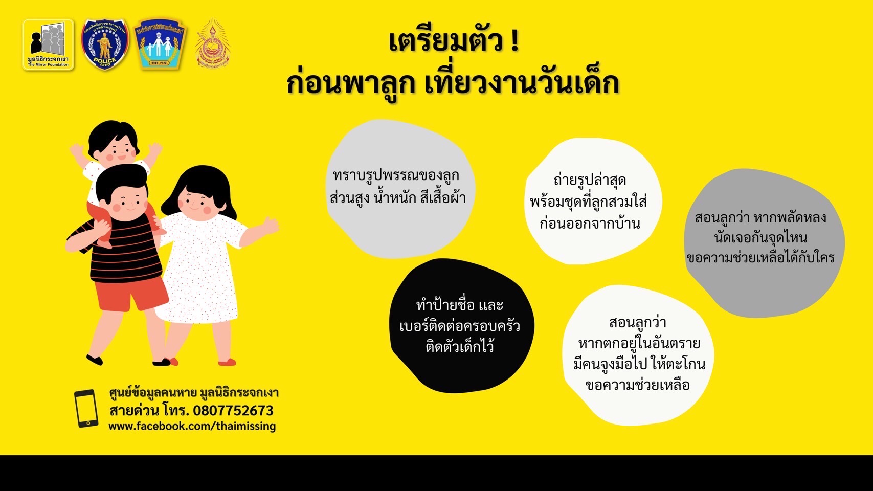 อย่างไรก็ตาม พล.ต.ต.ศารุติ แขวงโสภา ผบก.ปคม. ฝากไปยังผู้ปกครองทุกท่านว่า วันเด็กที่จะถึงนี้ให้ช่วยกันดูแลบุตรหลานให้ดี หากพลัดหลง ควรจํารูปพรรณของลูก เช่นส่วนสูง ตําหนิ หรือเสื้อผ้าที่ใส่ และควรสอนให้ลูกรู้ว่าหากพลัดหลงให้เจอกันที่จุดไหน ทั้งนี้หากเกิดการสูญหายและค้นหาไม่เจอจริงๆให้รีบโทรแจ้ง 1191 ทันทีโดยไม่ต้องรอครบ 24 ชม.