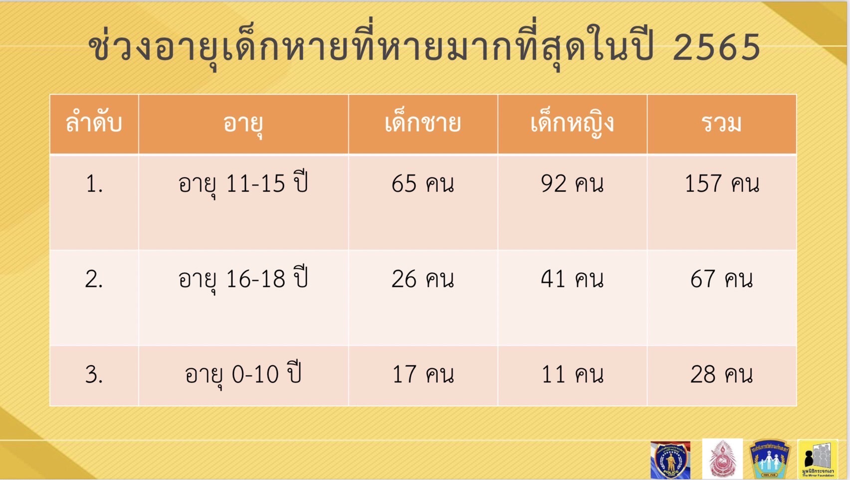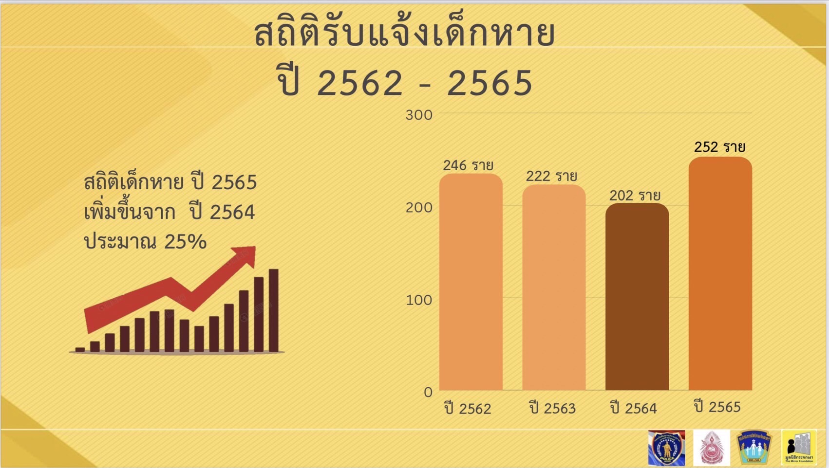 สำหรับแนวโน้มสถานการณ์เด็กหาย พบว่าในรอบ 4 ปีที่ผ่านมา ปี 2565 มีสถิติรับแจ้งเด็กหายเพิ่มสูงขึ้น โดยกลุ่มวัยรุ่นอายุ 11-15 ปี ถือว่ามีความเสี่ยงในการตัดสินใจหนีออกจากบ้าน โดยเฉพาะเด็กที่ได้รับผลกระทบจากความรุนแรงในครอบครัว ทำให้เด็กไปให้ความไว้วางใจเพื่อนหรือคนที่เพิ่งรู้จักในโลกออนไลน์ มากกว่าคนในครอบครัว