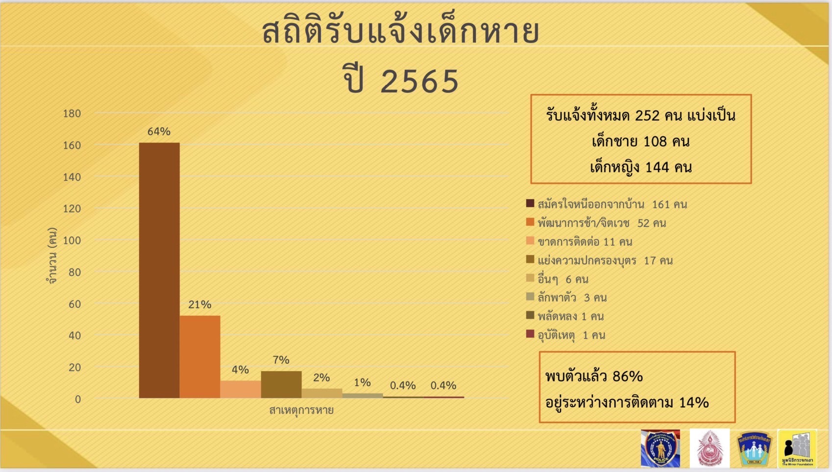 นายเอกลักษณ์ หลุ่มชมแข หัวหน้าศูนย์ข้อมูลคนหาย มูลนิธิกระจกเงา เผยว่า สถิติรับแจ้งเด็กหาย ของมูลนิธิกระจกเงา ปี 2565 มีจํานวนทั้งสิ้น 251 ราย ถือว่าเพิ่มสูงขึ้นในรอบ 4 ปี โดยสูงกว่าปี 2564 ถึง 25% สาเหตุหลักคือเด็กที่สมัครใจหนีออกจากบ้าน รองลงมาคือกลุ่มเด็กที่มีพัฒนาการช้า หรือป่วยทางจิตเวช และถูกลักพาตัว
