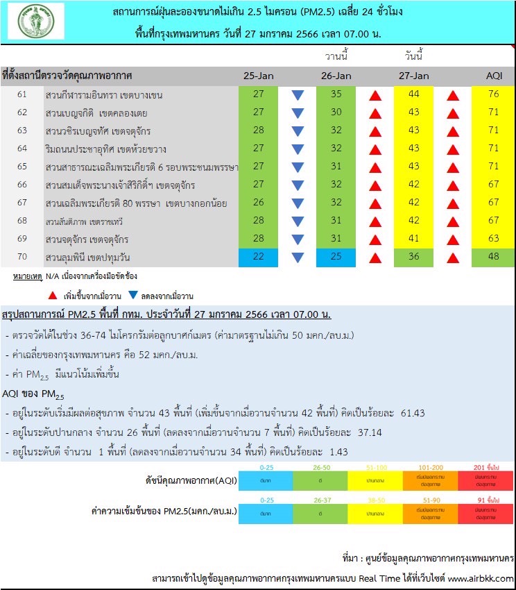ผลการตรวจวัด PM2.5 วันที่ 27 มกราคม 2566 เวลา 05.00-07.00 น. (3 ชั่วโมงล่าสุด) โดย ศูนย์ข้อมูลคุณภาพอากาศกรุงเทพมหานครขอสรุป ผลการตรวจวัดได้ 36-74 มคก./ลบ.ม. ค่าเฉลี่ยของกรุงเทพมหานคร 52.1 มคก./ลบ.ม.