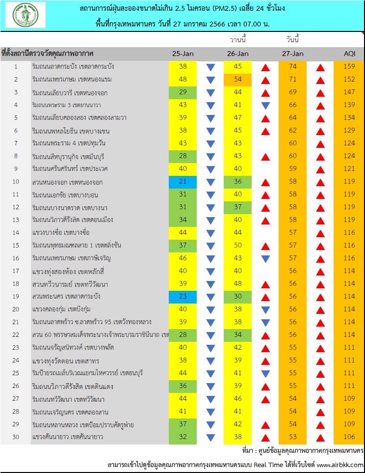 ผลการตรวจวัด PM2.5 วันที่ 27 มกราคม 2566 เวลา 05.00-07.00 น. (3 ชั่วโมงล่าสุด) โดย ศูนย์ข้อมูลคุณภาพอากาศกรุงเทพมหานครขอสรุป ผลการตรวจวัดได้ 36-74 มคก./ลบ.ม. ค่าเฉลี่ยของกรุงเทพมหานคร 52.1 มคก./ลบ.ม.