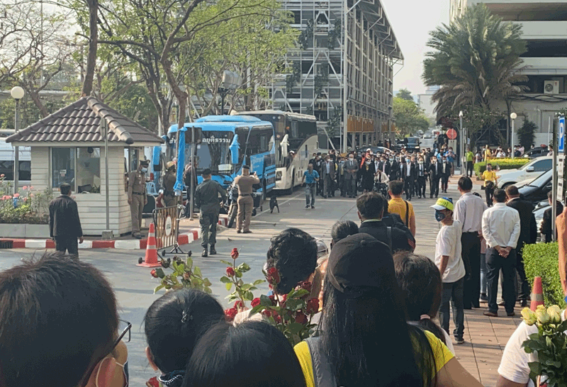 สำหรับ บรรยากาศบริเวณด้านหน้าศาลอาญา พบมีมวลชนเดินทางมารอให้กำลังใจและมอบดอกไม้ให้แกนนำจำนวนหนึ่ง โดยมีเจ้าหน้าที่จากทางศาลคอยอำนวยความสะดวกและดูแลรักษาความปลอดภัยอย่างเข้มงวด