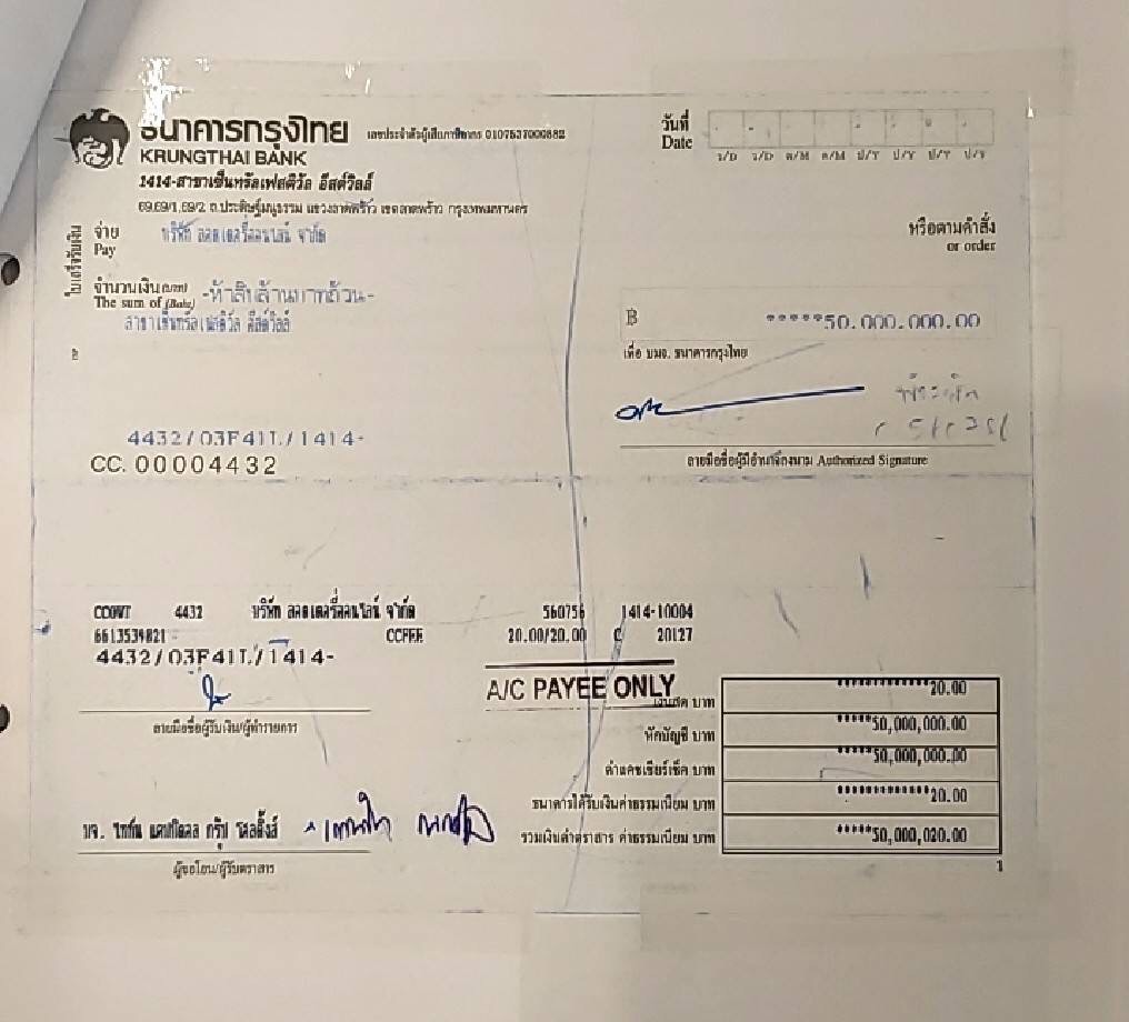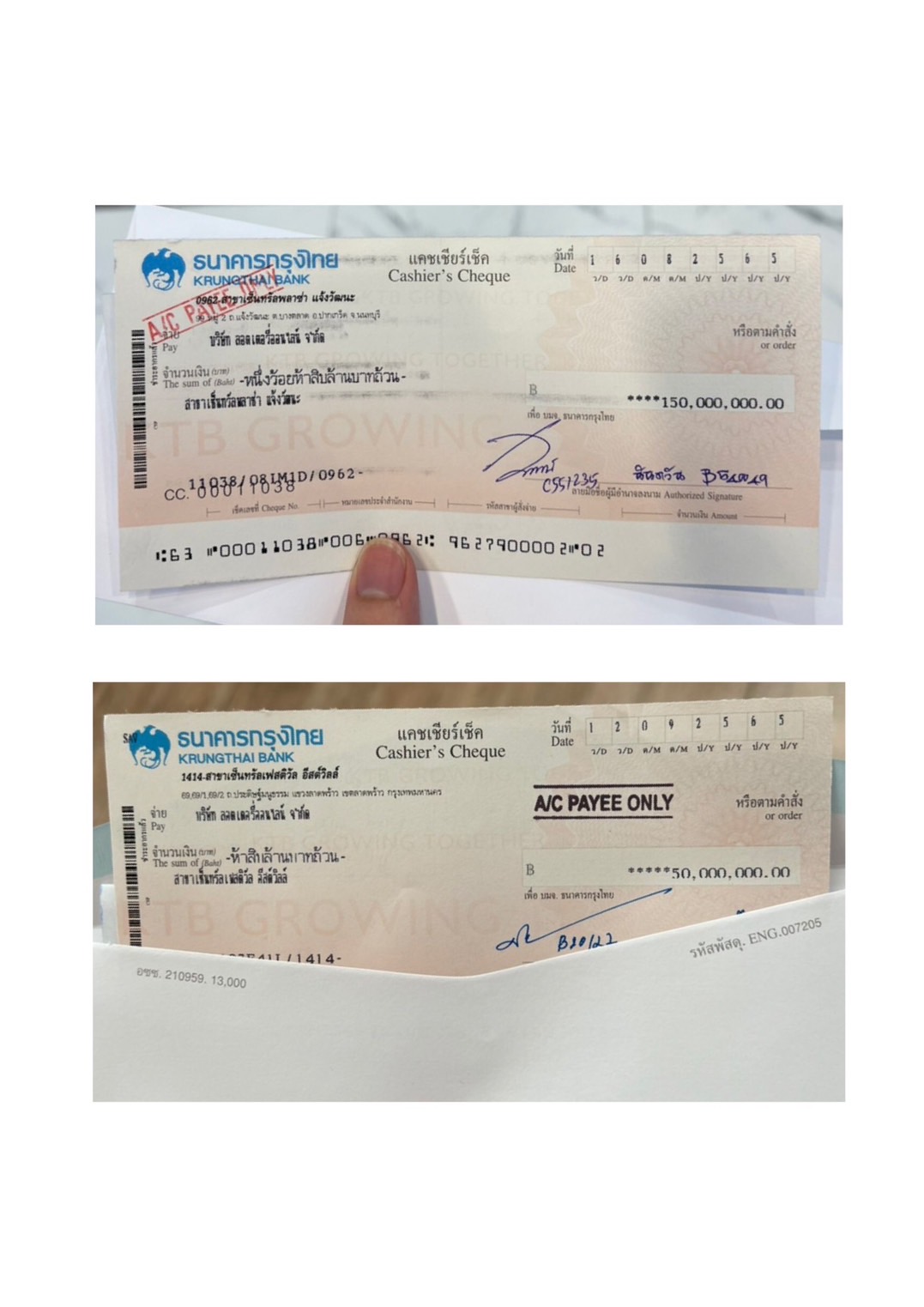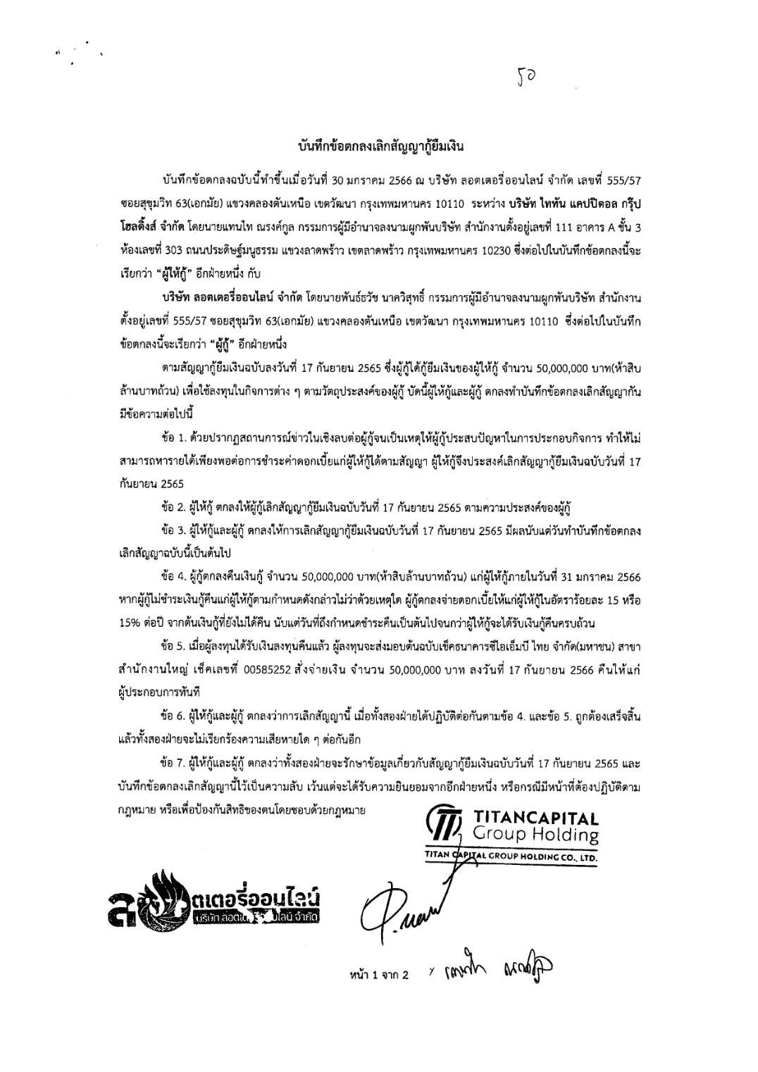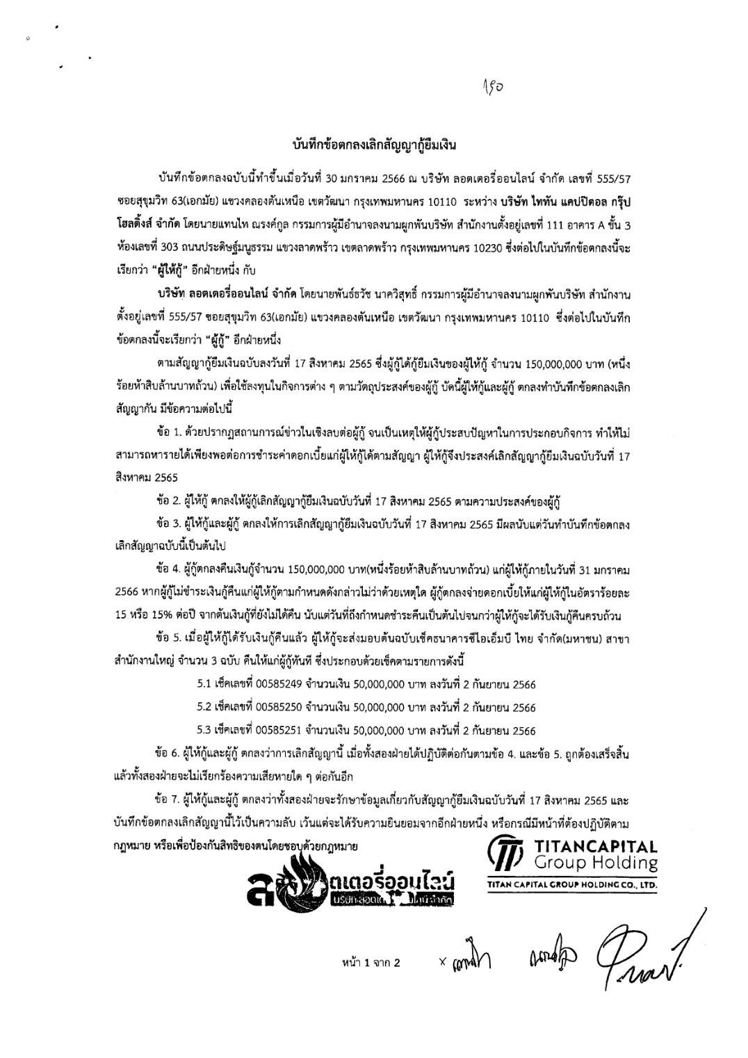 ตามสัญญา ผู้ให้กู้จึงประสงค์เลิกสัญญา” ซึ่งเงินที่ บริษัท ลอตเตอรี่ออนไลน์ จำกัด โดยมีสลิปเงินโอนคืนกลับมาให้ กับ บริษัท ไททัน แคปปิตอล กรุ๊ป โฮลดิ้งส์ จำกัด ในวันที่ 30 มกราคม 2566 จำนวน 100 รายการ รายการละ 2 ล้านบาท รวม 200 ล้านบาท