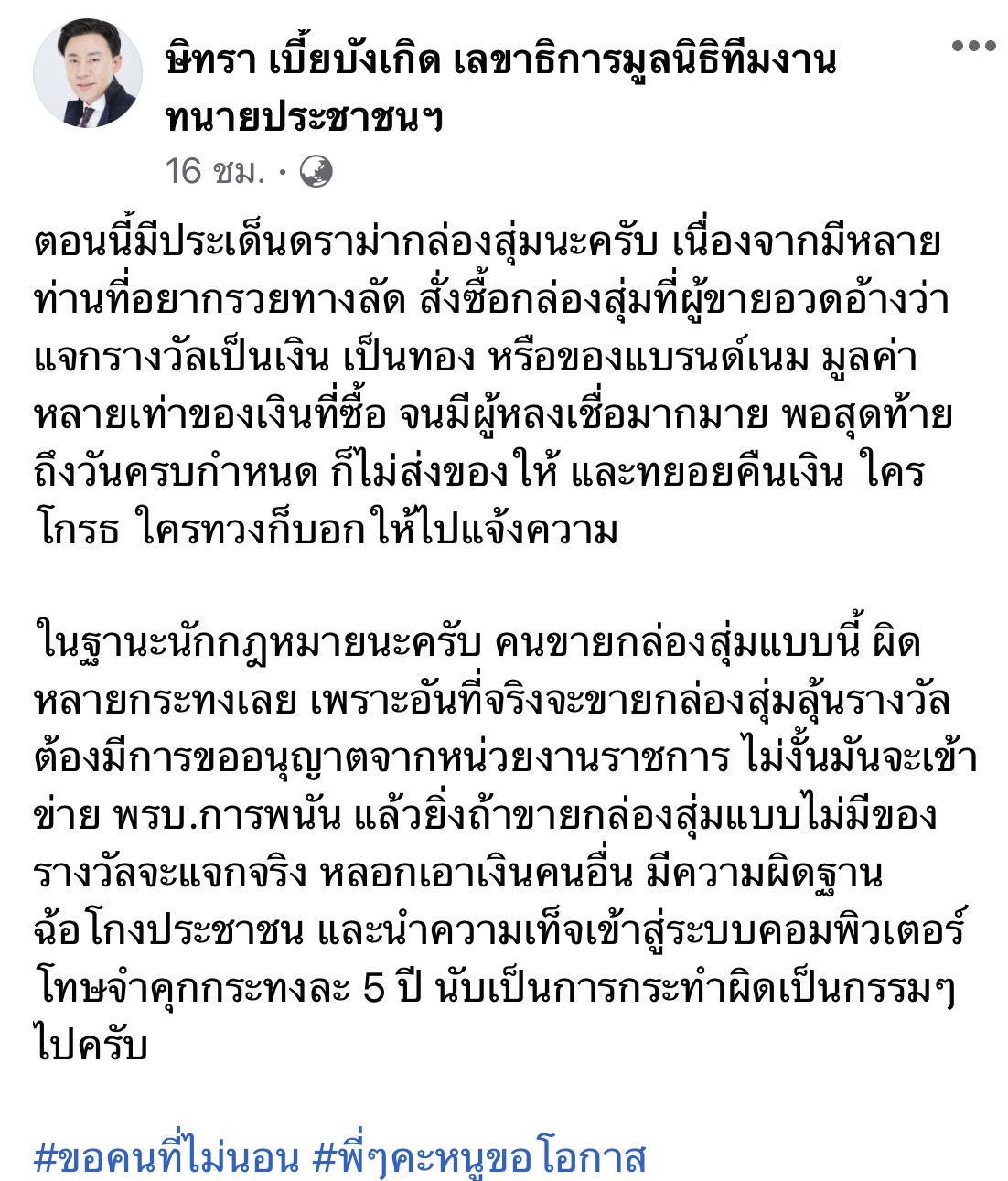 และทยอยคืนเงิน ใครโกรธ ใครทวงก็บอกให้ไปแจ้งความ ในฐานะนักกฎหมายนะครับ คนขายกล่องสุ่มแบบนี้ ผิดหลายกระทงเลย เพราะอันที่จริงจะขายกล่องสุ่มลุ้นรางวัล ต้องมีการขออนุญาตจากหน่วยงานราชการ ไม่งั้นมันจะเข้าข่ายพ.ร.บ.การพนัน แล้วยิ่งถ้าขายกล่องสุ่มแบบไม่มีของรางวัลจะแจกจริง หลอกเอาเงินคนอื่น มีความผิดฐานฉ้อโกงประชาชน และนำความเท็จเข้าสู่ระบบคอมพิวเตอร์ โทษจำคุกกระทงละ 5 ปี นับเป็นการกระทำผิดเป็นกรรมๆไปครับ”