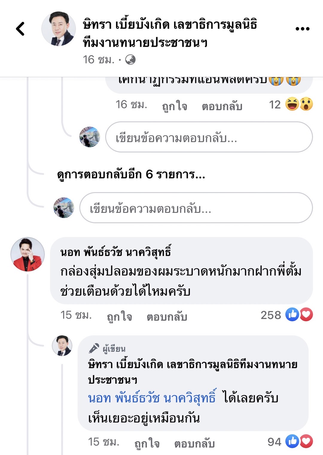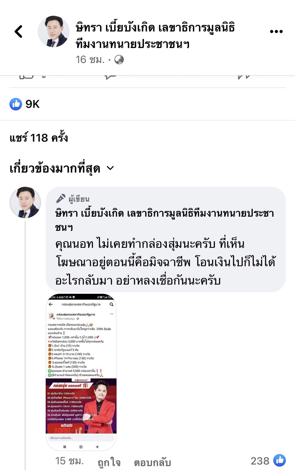 ต่อมา นายพันธ์ธวัช หรือ “นอท กองสลากพลัส” ได้เข้ามาแสดงความคิดเห็น ระบุว่า “กล่องสุ่มปลอมของผมระบาดหนักมากฝากพี่ตั้ม ช่วยเตือนด้วยได้ไหมครับ” ซึ่งทนายตั้ม ได้มีการแคปรูปจากเพจปลอมที่ใส่โลโก้ของกองสลากพลัส พร้อมยืนยันว่า ทางนอท ไม่เคยทำกล่องสุ่ม ที่เห็นโฆษณาอยู่ตอนนี้คือมิจฉาชีพ โอนเงินไปก็ไม่ได้อะไรกลับมา อย่าหลงเชื่อ