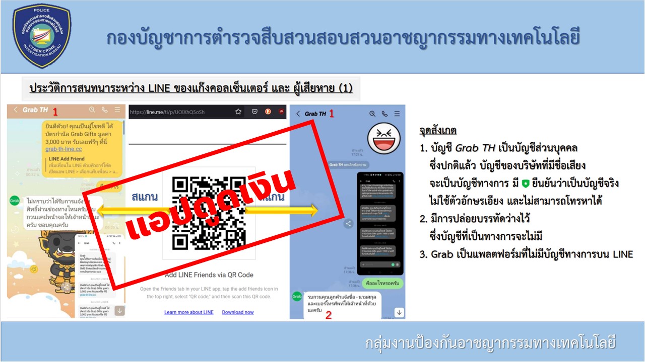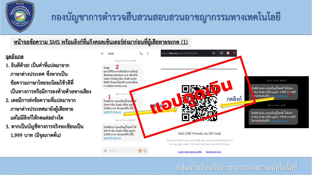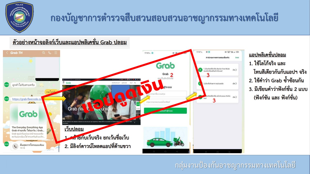พ.ต.อ.กฤษณะ พัฒนเจริญ โฆษก กองบัญชาการตำรวจสืบสวนสอบสวนอาชญากรรมทางเทคโนโลยี หรือ สอท.แจ้งเตือนภัยมิจฉาชีพแอบอ้างเป็น Grab ส่งข้อความสั้น หรือ SMS ไปยังเหยื่อแจ้งว่าเป็นผู้โชคดีได้รับบัตรกำนัลมูลค่าต่างๆ หลอกลวงให้ติดตั้งแอปพลิเคชันควบคุมโทรศัพท์มือถือดูดเงินออกจากบัญชี