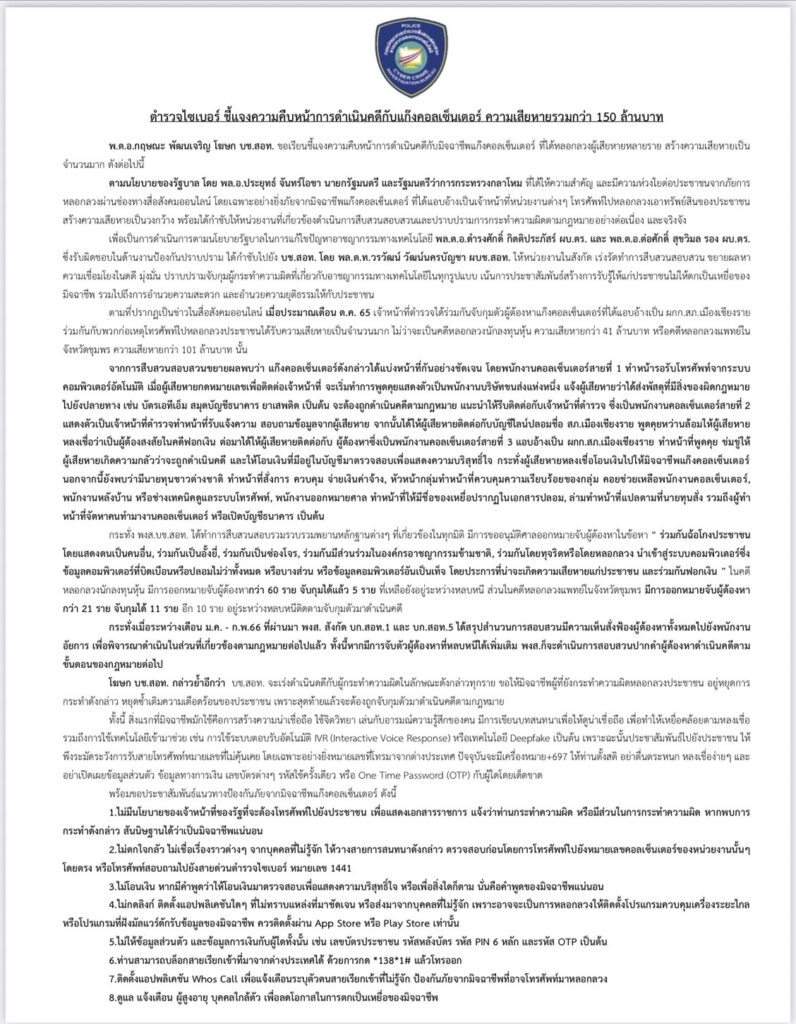 ตำรวจไซเบอร์ ชี้แจงความคืบหน้าการดำเนินคดีกับแก๊งคอลเซ็นเตอร์ ความเสียหายรวมกว่า 150 ล้านบาท