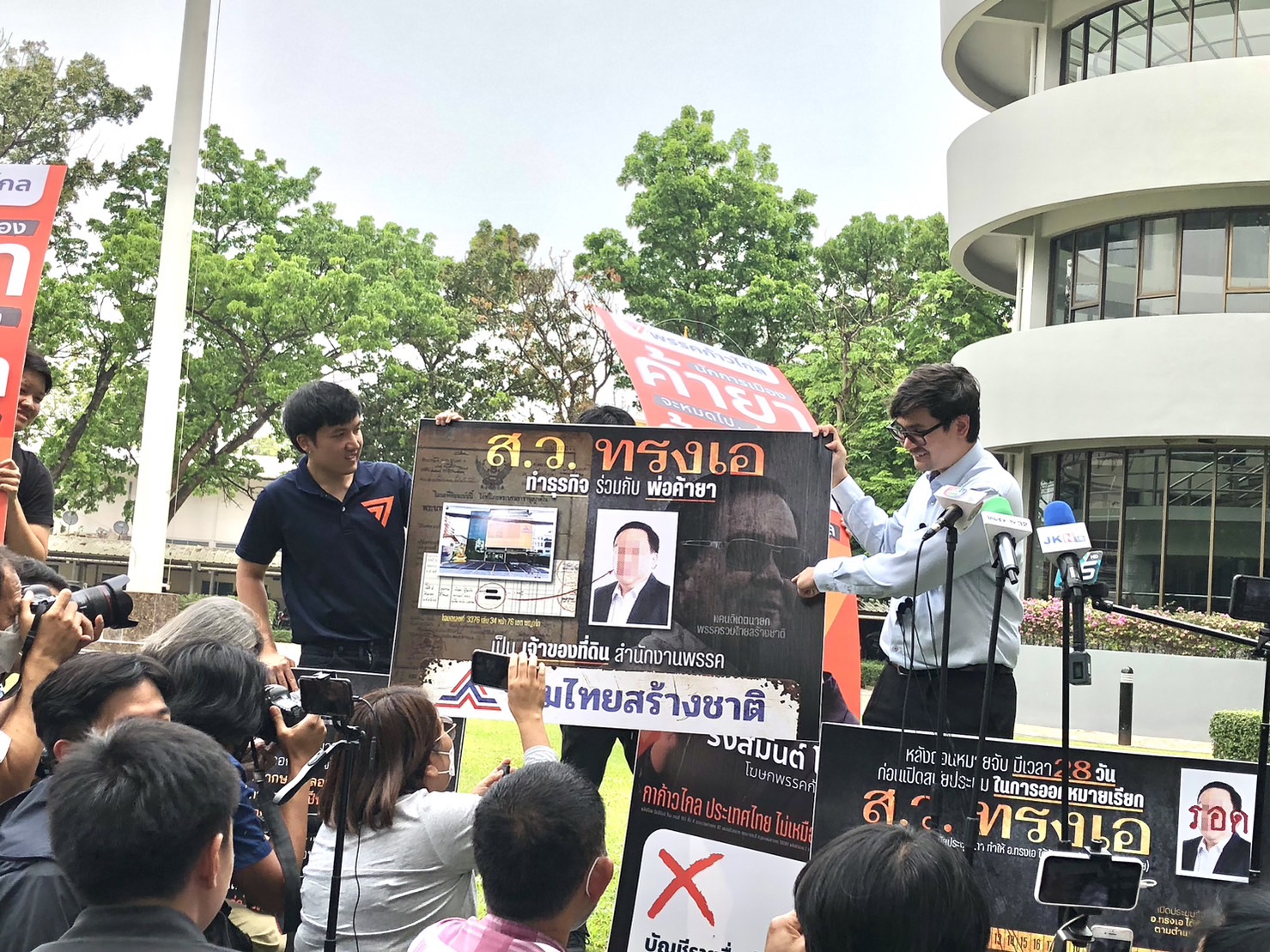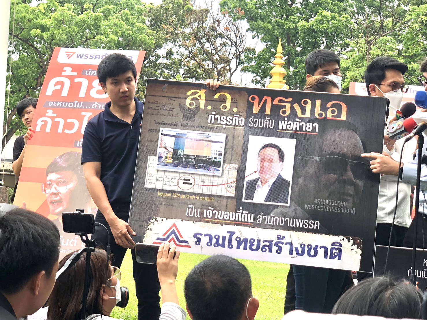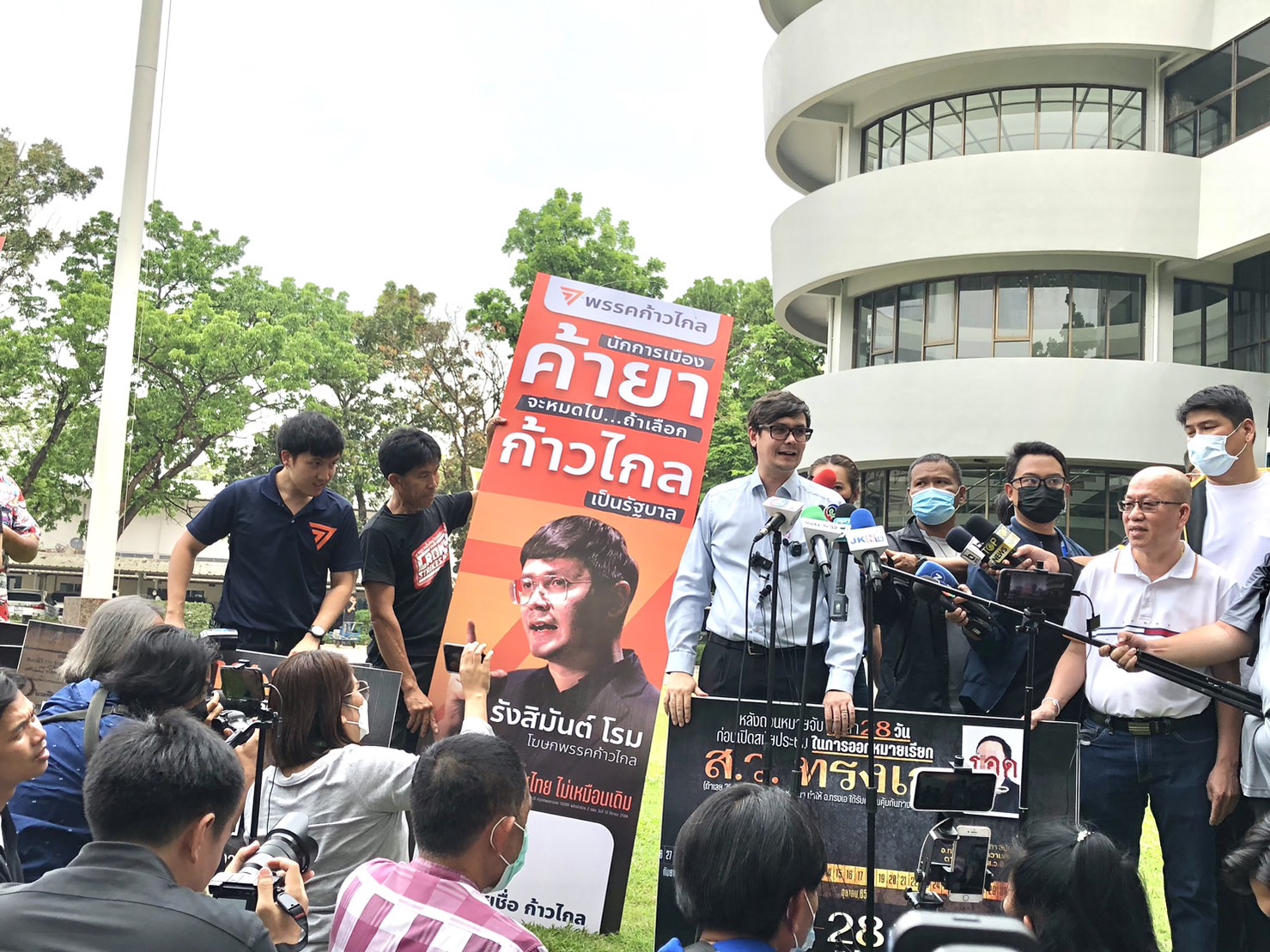 นอกจากนี้ นายรังสิมันต์ ได้นำป้ายหาเสียง 2 แผ่นมาแสดง พร้อมกล่าวว่า วันนี้ที่ตนนำมามี 2 ป้าย ระบุข้อความว่า นักการเมืองขายยาจะหมดไปได้ด้วยก้าวไกลเป็นรัฐบาล ทั้งนี้ตนไม่ได้ตั้งใจจะมาหาเสียงแต่ที่นำมาสองป้ายนี้ก็เพื่อจะมาติดที่หน่วยงานและหวังว่าเนื้อหาดังกล่าวจะสามารถใช้ป้ายนี้เป็นป้ายเตือนใจว่าจะทำคดีเรื่องนี้ให้อย่างดีที่สุด ส่วนตัวขณะนี้ที่อายุ 30 ปี รู้สึกกลัวที่จะถูกฟ้องกลับหลังออกมาเปิดเผยข้อมูลต่างๆ