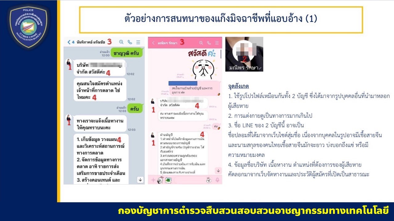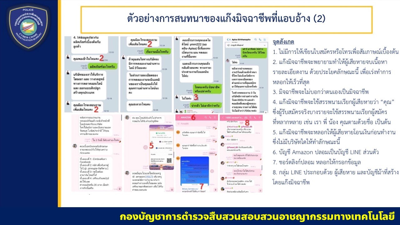 โดยที่ผ่านมา บช.สอท. ได้รับแจ้งความร้องทุกข์จากผู้เสียหายหลายรายว่า ได้รับโทรศัพท์จากมิจฉาชีพ แอบอ้างเป็นพนักงานบริษัทที่เคยกรอกข้อมูลหรือฝากประวัติส่วนตัว หมายเลขโทรศัพท์ และตำแหน่งที่สนใจไว้ผ่านเว็บไซต์หางานต่างๆ โดยมิจฉาชีพจะหลอกให้ทดลองงานก่อนเป็นเวลา 3 วัน หากผ่านการทดลองงานจะมีเจ้าหน้าที่ติดต่อไปแจ้งสวัสดิการต่างๆ