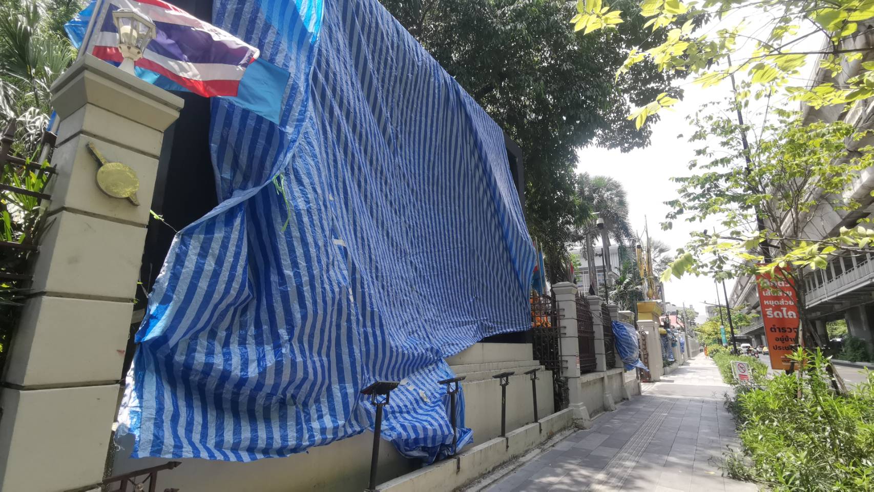 โดยพบว่าบริเวณป้ายหน้าประตูทางเข้า สำนักงานตำรวจแห่งชาติ ถนนพระราม 1 มีการนำผ้าใบลายสีน้ำเงินขาวมาปิดบังป้ายไว้เพื่อป้องกันความเสียหายที่อาจจะเกิดขึ้น ขณะเดียวกันได้มีการติดป้ายข้อความระบุว่า สถานที่ราชการห้ามติดป้ายประกาศ พร้อมกับจัดกำลังตำรวจสันติบาลคอยดูแลบริเวณด้านหน้าประตูทางเข้า