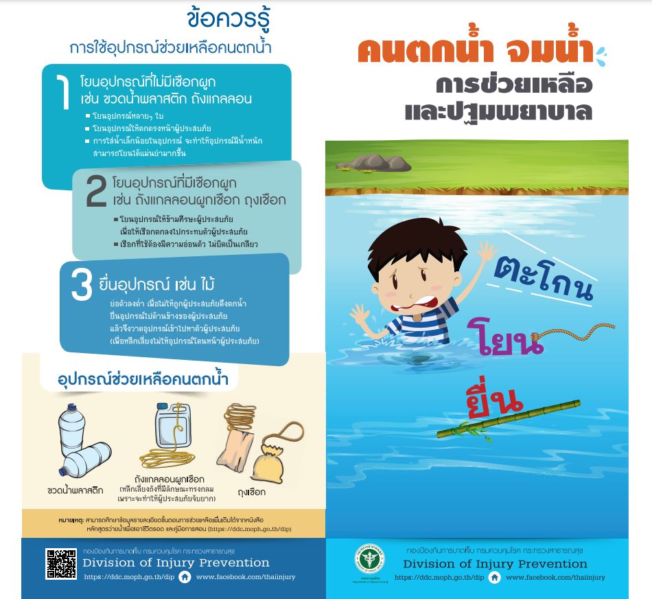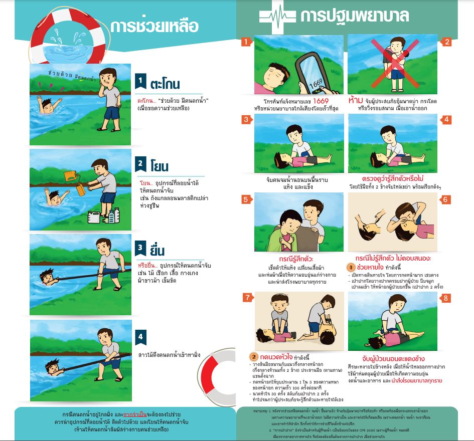 นายแพทย์รุ่งเรือง กล่าวต่อว่า สำหรับการช่วยเหลือคนตกน้ำหรือจมน้ำ ไม่ควรกระโดดลงไปช่วยทันทีแต่ควรใช้วิธีที่ปลอดภัย คือ 1.ตะโกน ขอความช่วยเหลือคนที่อยู่แถวบริเวณที่เกิดเหตุ 2.โยน อุปกรณ์ที่ลอยน้ำได้ (ห่วงชูชีพ, ถังแกลลอน, ถังพลาสติกเปล่า) ให้เกาะลอยน้ำ 3.ยื่นอุปกรณ์ เช่น ไม้ เชือก เสื้อ เข็มขัด ให้จับและดึงขึ้นจากน้ำ และเมื่อช่วยคนจมน้ำขึ้นมาแล้ว ห้ามอุ้มพาดบ่าหรือกระแทกเอาน้ำออก เนื่องจากเป็นวิธีการช่วยเหลือที่ผิด และจะทำให้ขาดอากาศหายใจนานขึ้น หากพบว่าไม่หายใจ ให้รีบทำ CPR และโทรแจ้งทีมแพทย์กู้ชีพ 1669 ทันที