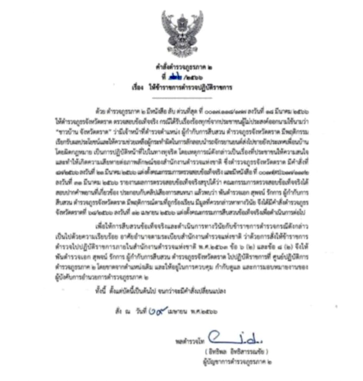พล.ต.ท.อิทธิพล อิทธิสารรณชัย ผู้บัญชาการตำรวจภูธร ภาค 2 เซ็นคำสั่งตำรวจภูธรภาค 2 ที่ 122/2566 เรื่อง ให้ข้าราชการตำรวจปฎิบัติราชการ ใจความระบุ ด้วยตำรวจภูธร ภาค 2 มีหนังสือ ลับ ด่วนที่สุด ที่ 0017.118/177 ลงวันที่ 18 มีนาคม 2566 ให้ตำรวจภูธรจังหวัดตราด ตรวจสอบข้อเท็จจริง