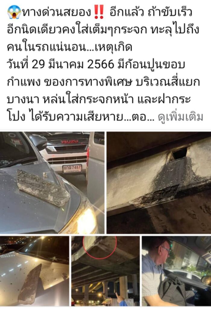 โดยเจ้าของโพสต์ระบุข้อความว่า “ทางด่วนสยอง อีกแล้ว ถ้าขับเร็วอีกนิดเดียวคงใส่เต็มๆกระจก ทะลุไปถึงคนในรถแน่นอน เหตุเกิดวันที่ 29 มีนาคม 2566 มีกัอนปูนขอบกำแพง ของการทางพิเศษ บริเวณสี่แยกบางนา หล่นใส่กระจกหน้า และฝากระโปง ได้รับความเสียหาย ตอนนี้แจ้งความเรียบร้อย แจ้งการทางพิเศษรับเรื่องแล้ว และแจ้งประกัน แล้วออกใบเครมเรียบร้อย ติดต่ออู่ซ่อมแล้ว แต่อู่บอกว่าจะได้ซ่อมก็ต้องหลังสงกรานต์ ไปแล้วเพราะช่วงนี้คิวเยอะ รถก็ขับไม่ได้ เพราะกระจกแตก ขอบกระจกเบี้ยว ฝากระโปรงบุบ รถคงต้องจอดอู่เข้ารอซ่อมทีเดียว ต้องใช้รถทุกวัน