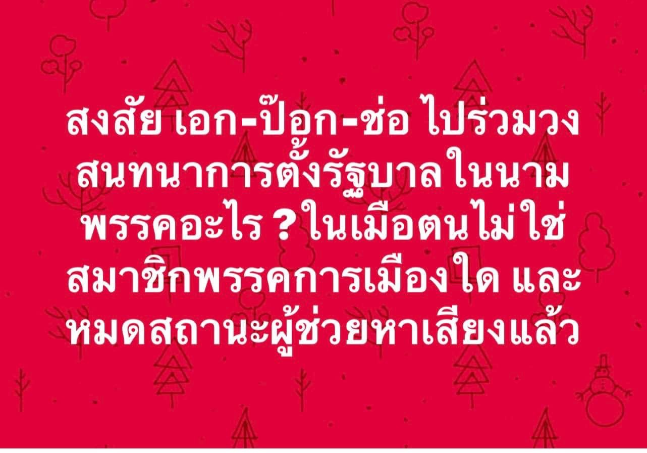 วันที่ 18 พ.ค.2566 ผู้สื่อข่าวรายงานว่า นายศรีสุวรรณ จรรยา เลขาธิการสมาคมองค์การพิทักษ์รัฐธรรมนูญไทย ได้เขียนข้อความในเฟซบุ๊กส่วนตัว ระบุว่า “สงสัย เอก-ป๊อก-ช่อ ไปร่วมวงสนทนาการตั้งรัฐบาลในนามพรรคอะไร ในเมื่อตนไม่ใช่สมาชิกพรรคการเมืองใด และหมดสถานะผู้ช่วยหาเสียงแล้ว”