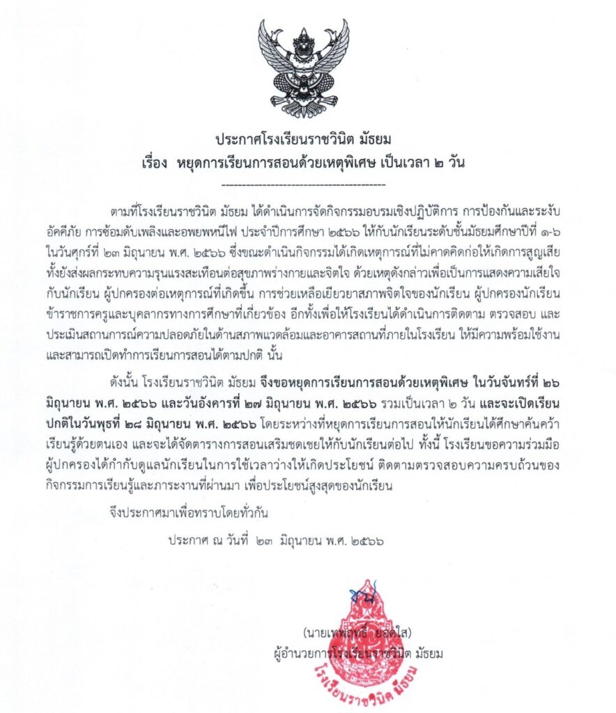 รร.ราชวินิต ประกาศหยุดเรียน 2 วัน 26-27 มิ.ย.นี้ เพื่อเยียวยาสภาพจิตใจ ครู-นักเรียน-ผู้ปกครอง เหตุถังดับเพลิงระเบิด