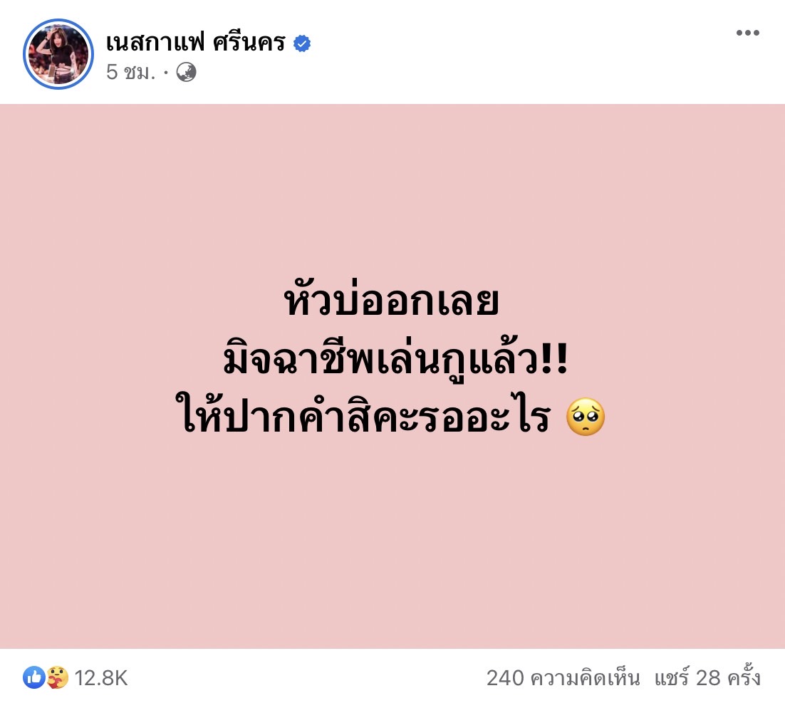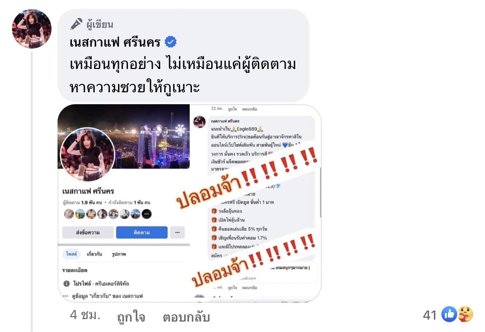 พร้อมทั้งแคปเฟซปลอมเฟซของตัวเอง เหมือนเป๊ะ ที่มีการปักหมุดชวนเล่นพนัน โดย เนสกาแฟ บอกว่า “เหมือนทุกอย่าง ไม่เหมือนแค่ผู้ติดตาม หาความซวยให้กูเนาะ”