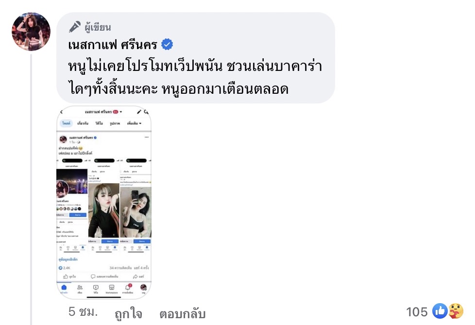 วันนี้ (27 ก.ค.66) เนสกาแฟ ศรีนคร หรือ นางสาวรัตติยา ศิลปินลูกทุ่งอินดี้ชื่อดังเจ้าของบทเพลง “เปิดใจให้ขี้เหล้าแน่” ที่มียอดวิวสูงกว่า 43 ล้านครั้ง เคลื่อนไหวโพสต์ผ่านเฟซบุ๊กว่า “หัวบ่ออกเลย มิจฉาชีพเล่นกูแล้ว!! ให้ปากคำสิคะรออะไร” พร้อมทั้งยังโพสต์เฟซปลอม โดยระบุด้วยว่า “หนูไม่เคยโปรโมทเว็บพนัน ชวนเล่นบาคาร่า ใดๆทั้งสิ้นนะคะ หนูออกมาเตือนตลอด” หลังงานเข้า โดนหมายเรียกโพสต์ข้อความชักชวนคนไปเล่นหวยออนไลน์ ผ่านกลุ่มไลน์บ้านพอใจ ในลักษณะของการแปะลิ้งก์ผ่านหน้าเพจเฟซบุ๊กของตนเอง