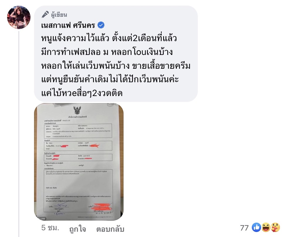รวมทั้งยังโชว์เอกสารแจ้งความ โดยบอกด้วยว่า “หนูแจ้งความไว้แล้ว ตั้งแต่2เดือนที่แล้ว มีการทำเฟสปลอม หลอกโอนเงินบ้าง หลอกให้เล่นเว็บพนันบ้าง ขายเสื้อขายครีม แต่หนูยืนยันคำเดิมไม่ได้ปักเว็บพนันค่ะ แค่ใบ้หวยสื่อๆ2งวดติด”