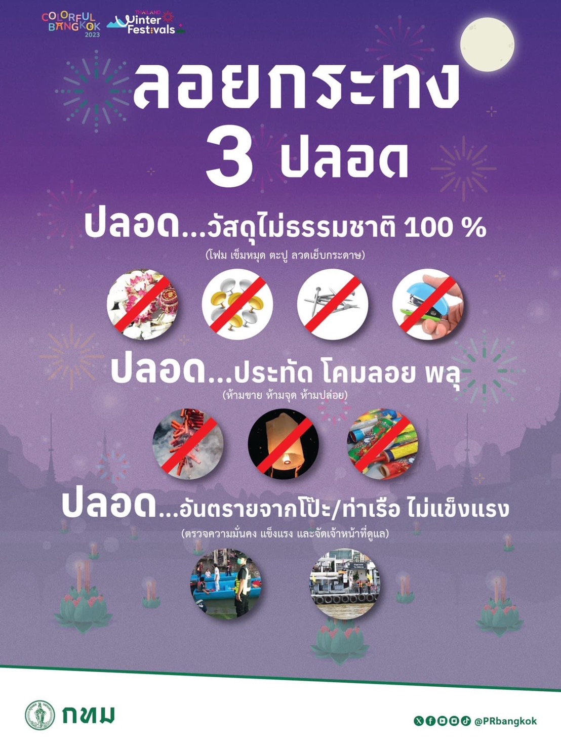 สำหรับวันลอยกระทงในปีนี้ตรงกับวันจันทร์ที่ 27 พ.ย.66 ซึ่งกรุงเทพมหานครได้รณรงค์มาตรการ 3 ปลอด คือ ปลอดจากวัสดุไม่ธรรมชาติ ปลอดจากประทัด โคมลอย พลุ และปลอดอันตรายจากโป๊ะ-ท่าเรือไม่แข็งแรง เนื่องจากคาดว่าจะมีประชาชนทั้งชาวไทยและชาวต่างชาติเดินทางไปท่องเที่ยวตามสถานที่ต่างๆ ในพื้นที่กรุงเทพมหานคร โดยเฉพาะท่าเทียบเรือโดยสารริมแม่น้ำเจ้าพระยา ซึ่งอาจก่อให้เกิดอุบัติเหตุจากท่าเทียบเรือพัง โป๊ะล่ม รวมทั้งความไม่เป็นระเบียบเรียบร้อย และอันตรายจากการเล่นดอกไม้เพลิงและโคมลอย เพื่อเป็นการเตรียมการป้องกันและแก้ไขปัญหาอุบัติภัยที่อาจเกิดขึ้น