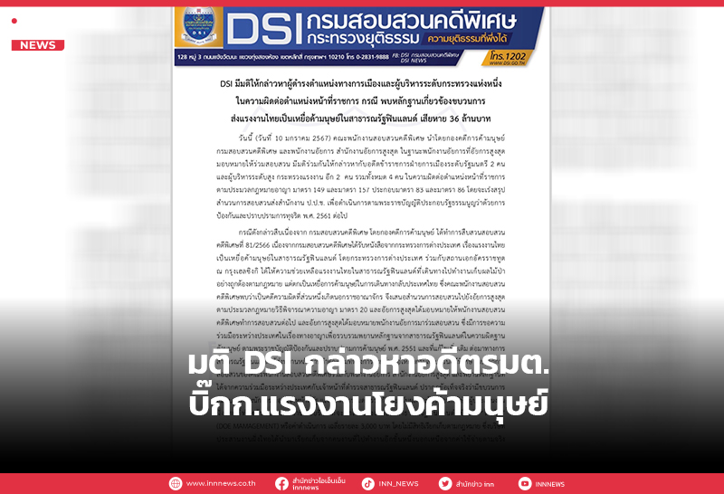 DSI มีมติให้กล่าวหาผู้ดำรงตำแหน่งทางการเมืองและผู้บริหารระดับกระทรวงแห่งหนึ่ง ในความผิดต่อตำแหน่งหน้าที่ราชการ กรณี พบหลักฐานเกี่ยวข้องขบวนการส่งแรงงานไทยเป็นเหยื่อค้ามนุษย์ในสาธารณรัฐฟินแลนด์ เสียหาย 36 ล้านบาท