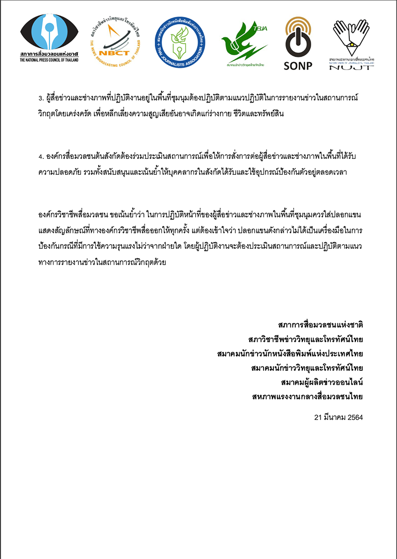 สนุนและเน้นย้ำให้บุคคลากรในสังกัดได้รับและใช้อุปกรณ์ป้องกันตัวอยู่ตลอดเวลาองค์กรวิชาชีพสื่อมวลชน ขอเน้นย้ำว่า ในการปฏิบัติหน้าที่ของผู้สื่อข่าวและช่างภาพในพื้นที่ชุมนุมควรใส่ปลอกแขนแสดงสัญลักษณ์ที่ทางองค์กรวิชาชีพสื่อออกให้ทุกครั้ง แต่ต้องเข้าใจว่า ปลอกแขนดังกล่าวไม่ได้เป็นเครื่องมือในการป้องกันกรณีที่มีการใช้ความรุนแรงไม่ว่าจากฝ่ายใด โดยผู้ปฏิบัติงานจะต้องประเมินสถานการณ์และปฏิบัติตามแนวทางการรายงานข่าวในสถานการณ์วิกฤตด้วย