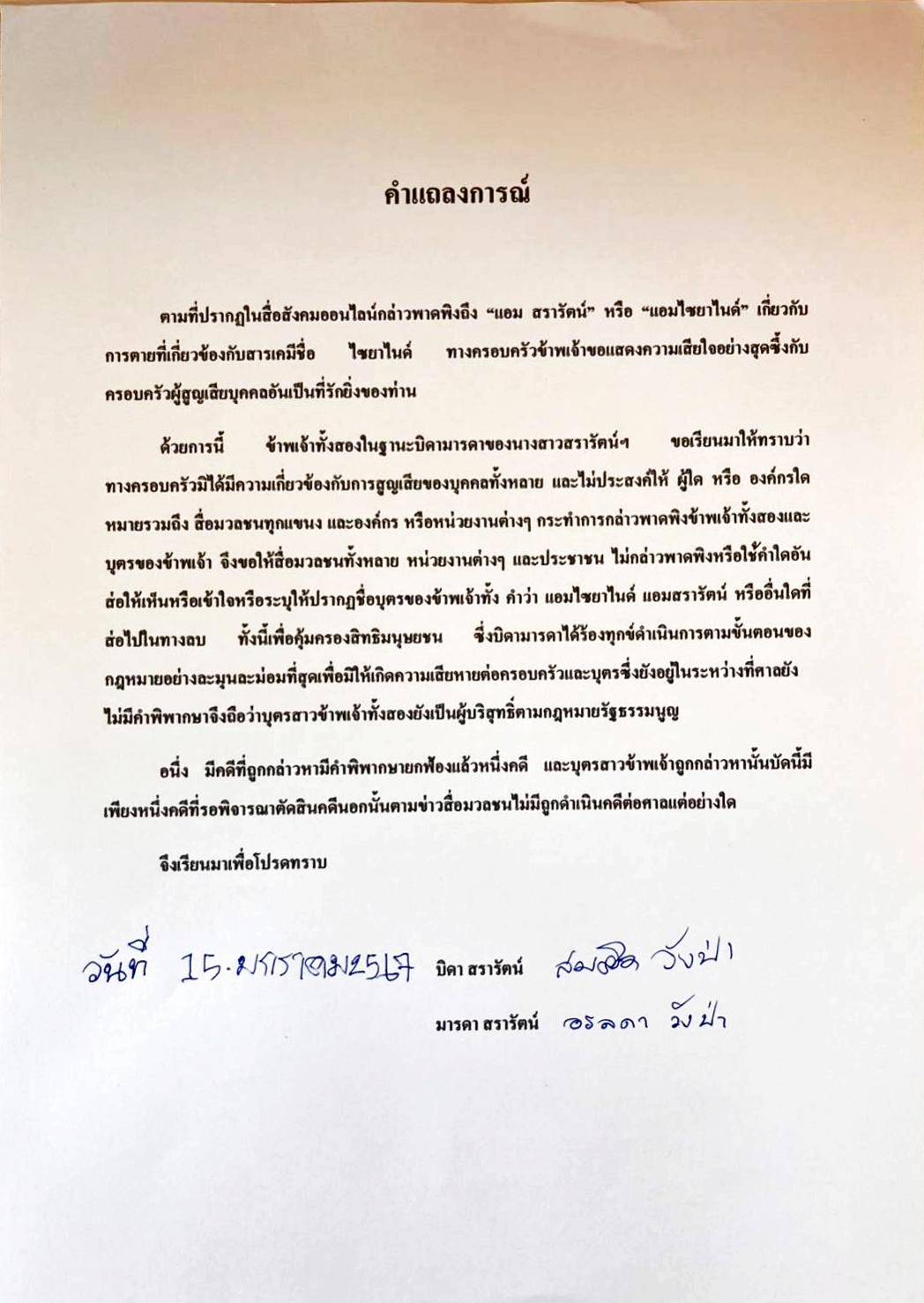 วันที่ 15 ม.ค.67 นายสมคิด วังป่า และ นางอรลดา วังป่า บิดาและมารดาของ น.ส. สรารัตน์” หรือ “แอมไซยาไนด์” ได้ออกแถลงการณ์ชี้แจงผ่านสื่อ โดยระบุว่าตามที่ปรากฏในสื่อสังคมออนไลน์กล่าวพาดพิงถึง “แอม สรารัตน์” หรือ “แอมไซยาไนด์” เกี่ยวกับการตายที่เกี่ยวข้องกับสารเคมีชื่อ ไซยาไนด์ ทางครอบครัวข้าพเจ้าขอแสดงความเสียใจอย่างสุดซึ้งกับครอบครัวผู้สูญเสียบุคคลอันเป็นที่รักยิ่งของท่าน