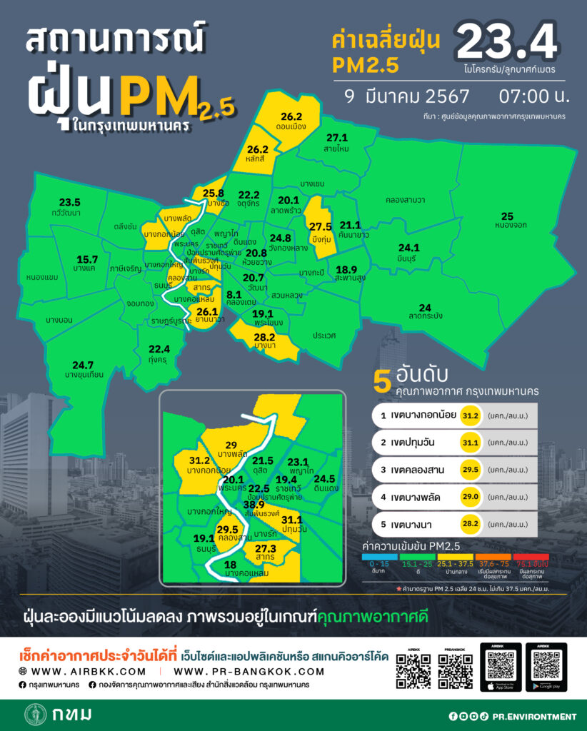 ศูนย์ข้อมูลคุณภาพอากาศกรุงเทพมหานคร ขอรายงานสถานการณ์ฝุ่นละอองขนาดไม่เกิน 2.5 ไมครอน (PM 2.5) ในกรุงเทพมหานคร ประจำวันที่ 9 มีนาคม 2567 เวลา 07:00 น.