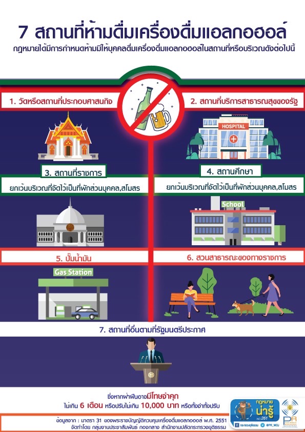 ทั้งนี้กฎหมายได้มีการกำหนดห้ามมิให้บุคคลดื่มเครื่องดื่มแอลกอฮอล์ในสถานที่หรือบริเวณดังต่อไปนี้1.วัดหรือสถานที่ประกอบศาสนกิจ 2.สถานที่บริการสาธารณสุขของรัฐ 3.สถานที่ราชการ