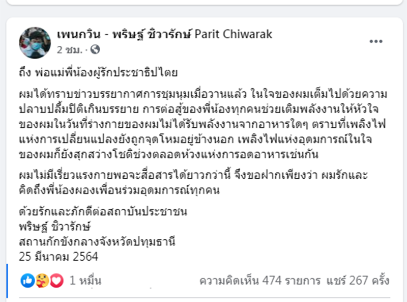 วันนี้เมื่อเวลาประมาณ 18.00 น. เพจเฟสบุ๊ก “เพนกวิน – พริษฐ์ ชิวารักษ์ Parit Chiwarak” ได้มีการข้อข้อความ ระบุว่า