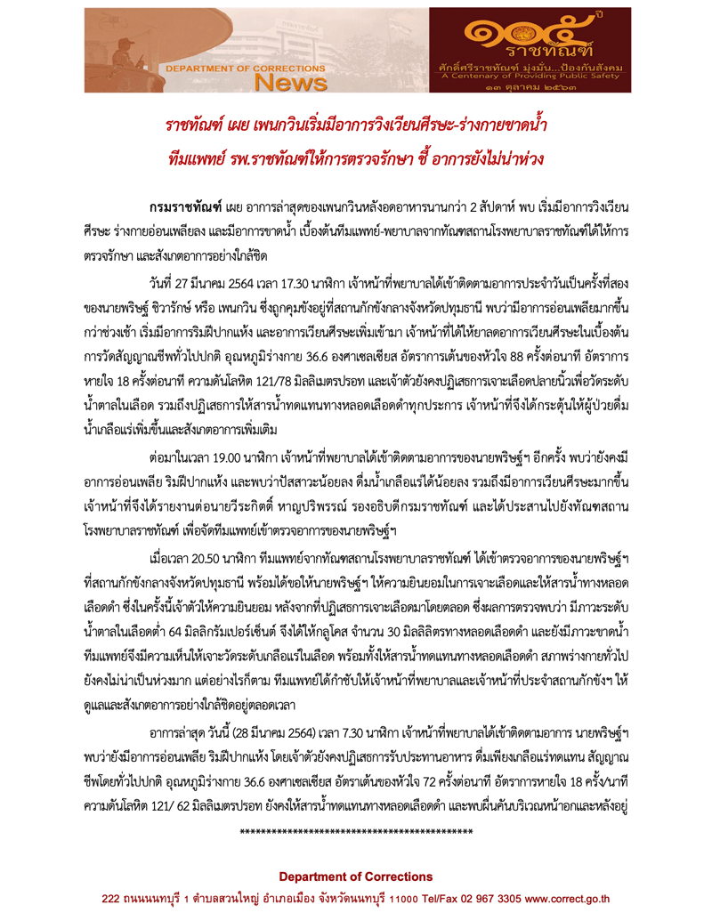 แต่อย่างไรก็ตาม ทีมแพทย์ได้กำชับให้เจ้าหน้าที่พยาบาลและเจ้าหน้าที่ประจำสถานกักขังฯ ให้ดูแลและสังเกตอาการอย่างใกล้ชิดอยู่ตลอดเวลา
