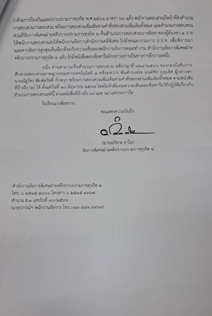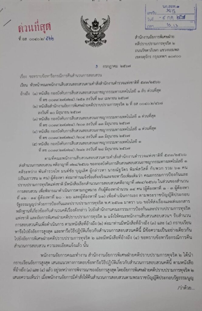 อนึ่ง ท่านสามารถรับสำนวนการสอบสวน คดีอาญาที่ 724/2566 ของกองบังคับการการสอบสวนอาชญากรรมทางเทคโนโลยี 1 คดีระหว่าง พันตำรวจโท มนต์ชัย บุญเลิส ผู้กล่าวหา นายณัฐวัตร พิมพ์สวัสดิ์ กับพวก พร้อมการสอบสวนเพิ่มเติมตามคำสั่งสอบสวนเพิ่มเติมทั้งหมดได้ ตั้งแต่วันที่ 10 มิ.ย.2567 โดยไม่จำต้องรอความเห็นตอบข้อหารือวิธีปฏิบัติเกี่ยวกับสำนวนการสอบสวนคดีนี้แต่ประการใด