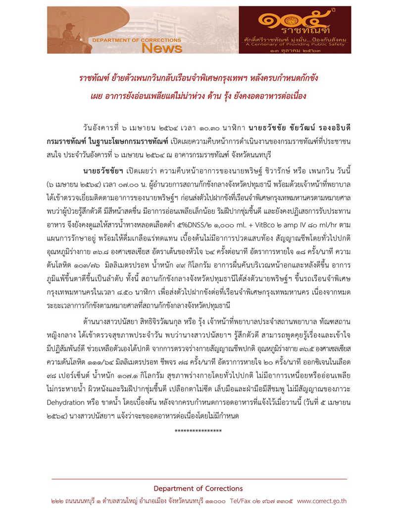 นายธวัชชัย ชัยวัฒน์ รองอธิบดีกรมราชทัณฑ์ ในฐานะโฆษกกรมราชทัณฑ์ เปิดเผยว่า ความคืบหน้าอาการของนายพริษฐ์ ชิวารักษ์ หรือ เพนกวิน วันนี้ (6 เม.ย. 64) เวลา 07.00 น. ผู้อำนวยการสถานกักขังกลางจังหวัดปทุมธานี พร้อมด้วยเจ้าหน้าที่พยาบาลได้เข้าตรวจเยี่ยมติดตามอาการของนายพริษฐ์ฯ ก่อนส่งตัวไปฝากขังที่เรือนจำพิเศษกรุงเทพมหานครตามหมายศาล