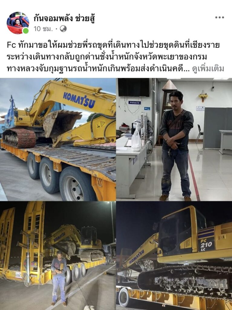 โดยเพจเฟซบุ๊ก “กันจอมพลัง ช่วยสู้” โพสต์ระบุว่า “Fc ทักมาขอให้ผมช่วยพี่รถขุดที่เดินทางไปช่วยขุดดินที่เชียงราย ระหว่างเดินทางกลับถูกด่านชั่งน้ำหนักจังหวัดพะเยาของกรมทางหลวงจับกุมฐานรถน้ำหนักเกินพร้อมส่งดำเนินคดีและถ้าจะประกันตัวและรถต้องใช้หลักทรัพย์กว่า 320,000 หลังจากประกันต้องไปศาลต่อเพื่อจ่ายค่าปรับและมีคดีติดตัว เคสนี้ผมรับปากช่วยผมจะจ่ายค่าปรับให้เอง