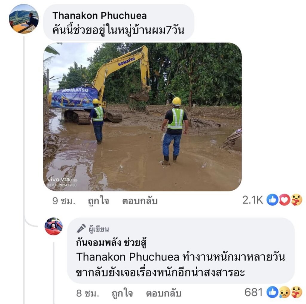 ส่วนรถขุดคันอื่นๆที่มาช่วยขุดดินออกจากเชียงรายแล้วขากลับโดนจับน้ำหนักเกินผมจะช่วยจ่ายค่าปรับให้ทั้งหมด สิ่งที่ผมห่วงต่อไปใครจะกล้ามาช่วยเชียงรายช่วยแล้วต้องมีคดีติดตัวแล้วขากลับรถขุดจะกลับกันยังไง