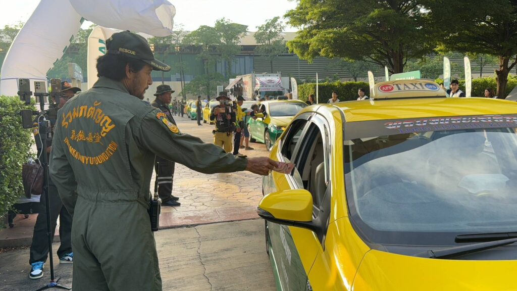 สำหรับสิ่งของที่นำมาบริจาคน มี ไข่ไก่เบอร์ 3 ยาสีฟัน และเงินสด คันละ 500 บาท มอบให้กับคนขับรถแท็กซี่ ถือเป็นการสร้างรอยยิ้มและกำลังใจให้กับคนขับรถแท็กซี่ในวันนี้เป็นอย่างมาก