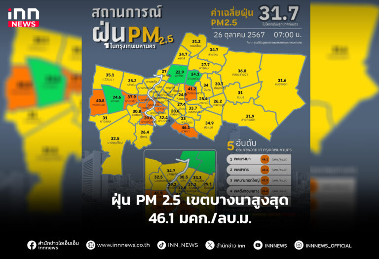 ฝุ่น PM 2.5 ในกรุงเทพมหานคร พบ สูงสุดในเขตบางนา 46.1 มคก./ลบ.ม.