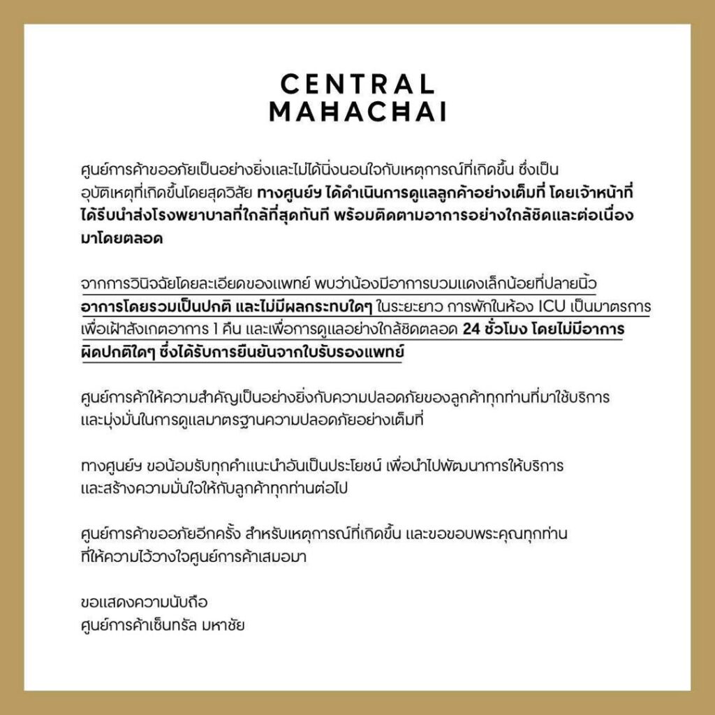 จากการวินิจฉัยโดยละเอียดของแพทย์ พบว่าน้องมีอาการบวมแดงเล็กน้อยที่ปลายนิ้ว อาการโดยรวมเป็นปกติ และไม่มีผลกระทบใดๆ ในระยะยาว การพักในห้อง ICU เป็นมาตรการเพื่อเฝ้าสังเกตอาการ 1 คืน และเพื่อการดูแลอย่างใกล้ชิดตลอด 24 ชั่วโมง โดยไม่มีอาการผิดปกติใดๆ ซึ่งได้รับการยืนยันจากใบรับรองแพทย์ ศูนย์การค้าให้ความสำคัญเป็นอย่างยิ่งกับความปลอดภัยของลูกค้าทุกท่านที่มาใช้บริการ และมุ่งมั่นในการดูแลมาตรฐานความปลอดภัยอย่างเต็มที่