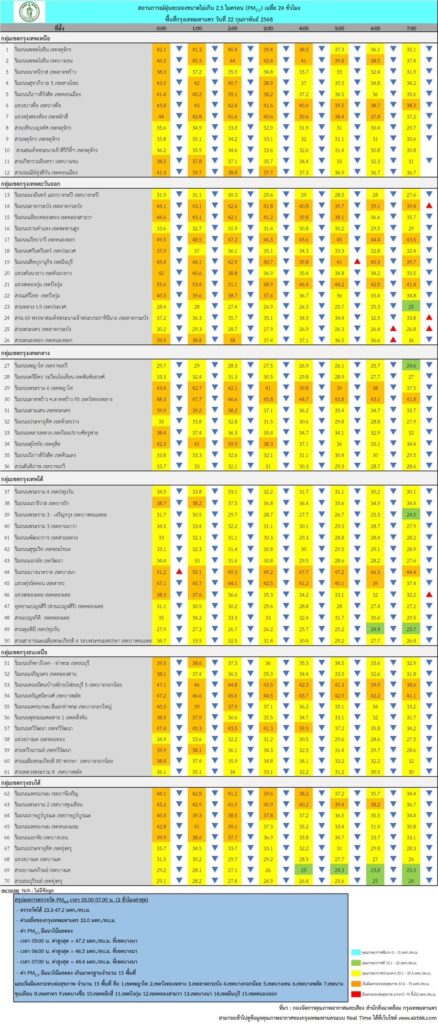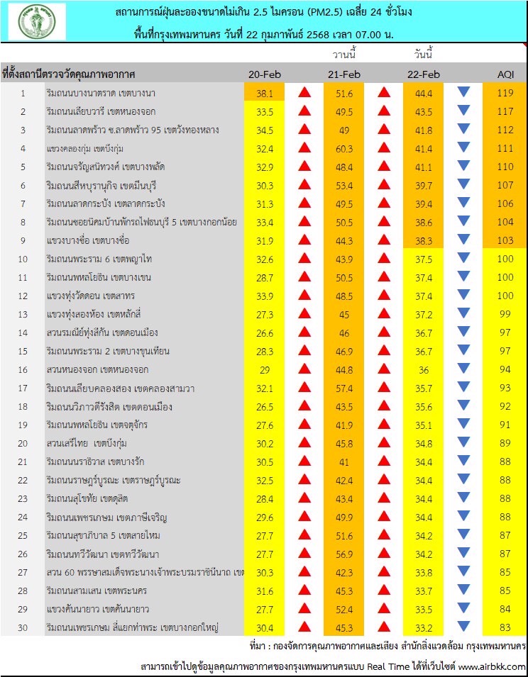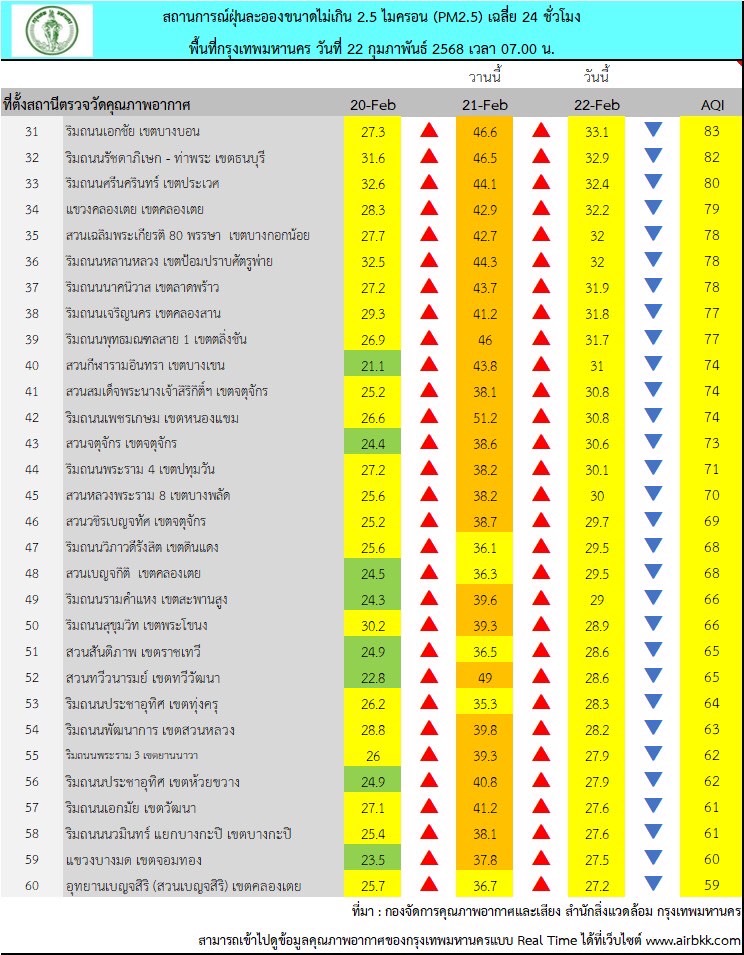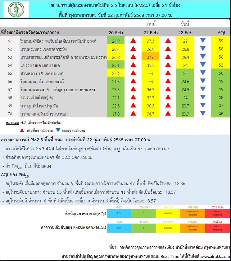 ศูนย์ข้อมูลคุณภาพอากาศกรุงเทพมหานครขอสรุปผลการตรวจวัด PM2.5 ประจำ วันที่ 22 กุมภาพันธ์ 2568เวลา 05.00-07.00 น. (3 ชั่วโมงล่าสุด)