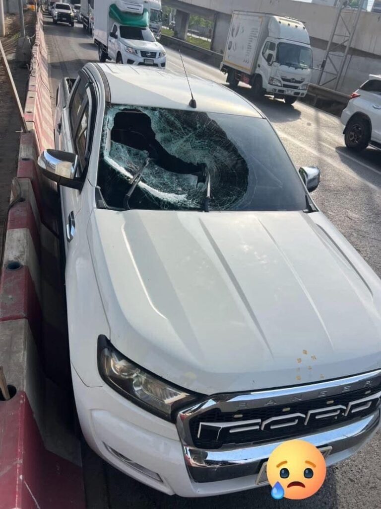 มายังไง? ก้อนปูนขนาดใหญ่ตกใส่กระจกรถ ขณะรถแล่นผ่านใต้ทางต่างระดับ ถนนพระราม 2 ทำคนขับบาดเจ็บ