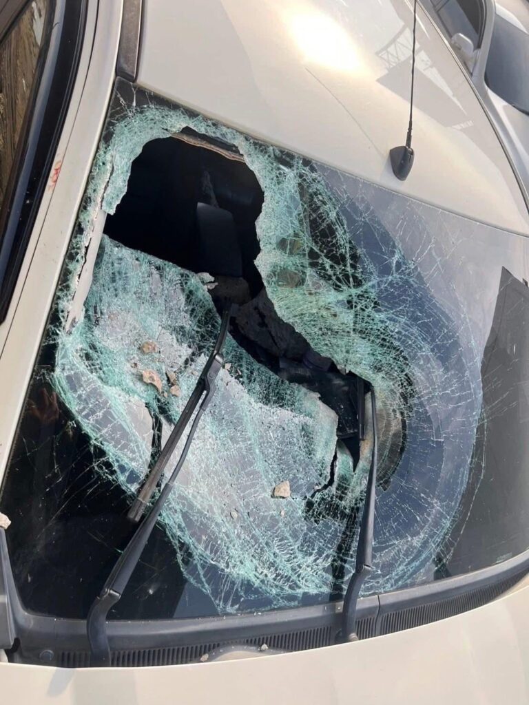มายังไง? ก้อนปูนขนาดใหญ่ ตกใส่กระจกรถ พระราม 2-คนขับเจ็บ