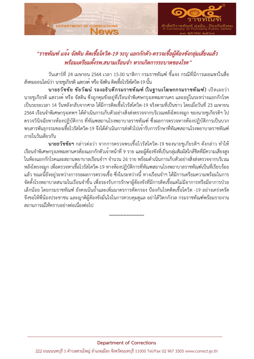 ตรวจเชื้อแล้วเช่นกัน การติดเชื้อครั้งนี้เกิดขึ้นในแดนกักโรค ไม่ใช่แดนทั่วไป เพราะบุคคลกลุ่มดังกล่าวเป็นผู้ต้องขังเข้าใหม่ และพึ่งกลับจากการไปศาล ดังนั้นจึงต้องอยู่ในแดนกักโรค 14 วันตามมาตรการของกรมราชทัณฑ์