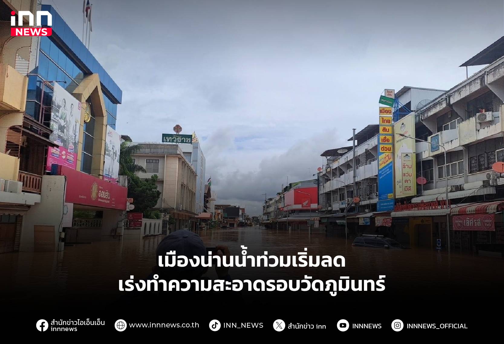 ระดับน้ำท่วมในเมืองน่าน น้ำเริ่มลดลงบ้างแล้ว แต่บางจุดยังท่วมสูง วัดภูมินทร์ น้ำลด จนท.เร่งฉีดล้างทำความสะอาด