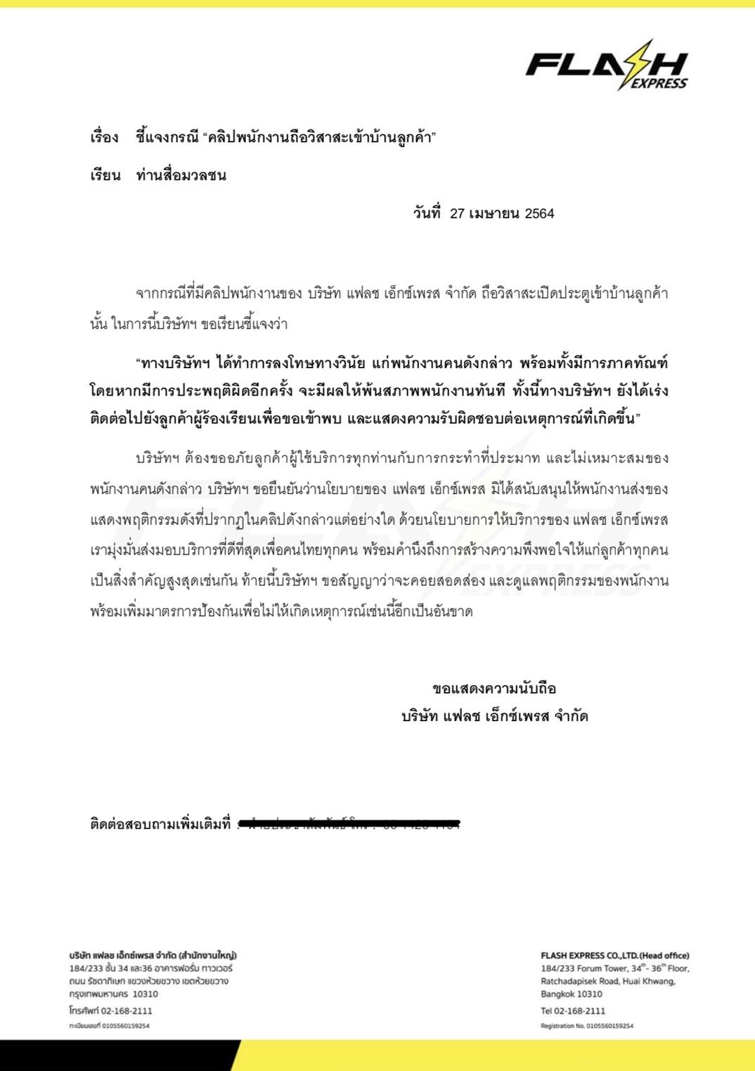 บริษัท ต้องขออภัยลูกค้าผู้ใช้บริการทุกท่านกับการกระทำที่ประมาทและไม่เหมาะสมของพนักงานคนดังกล่าว บริษัทขอยืนยันว่านโยบายของ แฟลช เอ็กซ์เพรส สนับสนุนให้พนักงานส่งของแสดงพฤติกรรมดังที่ปรากฏในคลิปดังกล่าวแต่อย่างใด ด้วยนโยบายการให้บริการของ แฟลช เอ็กซ์เพรส เรามุ่งมั่นส่งมอบบริการที่ดีที่สุดเพื่อคนไทยทุกคนพร้อมคำนึงถึงการสร้างความพึงพอใจให้แก่ลูกค้าทุกคนเป็นสิ่งสำคัญสูงสุดเช่นกัน