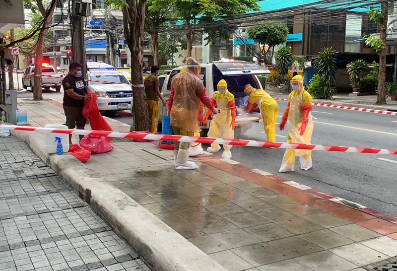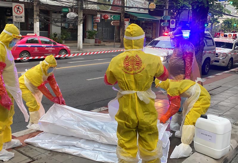จนท.กู้ภัย สวมชุด PPE เก็บร่างหนุ่มนิรนามวัย 50 นอนตายปริศนา ริมถนนสุรวงศ์