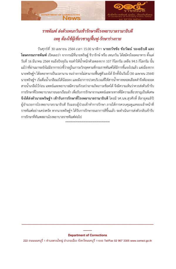 วันศุกร์ที่ 30 เมษายน 2564 เวลา 15.00 นาฬิกา นายธวัชชัย ชัยวัฒน์ รองอธิบดี และ โฆษกกรม ราชทัณฑ์ เปิดเผยว่า จากกรณีที่นายพริษฐ์ ชิวารักษ์ หรือ เพนกวิน ได้สมัครใจอดอาหาร ตั้งแต่วันที่ 16 มีนาคม 2564 จนถึงปัจจุบัน จนทำให้น้ำหนักตัวลดลงจาก 107 กิโลกรัม เหลือ 94.5 กิโลกรัม นั้น