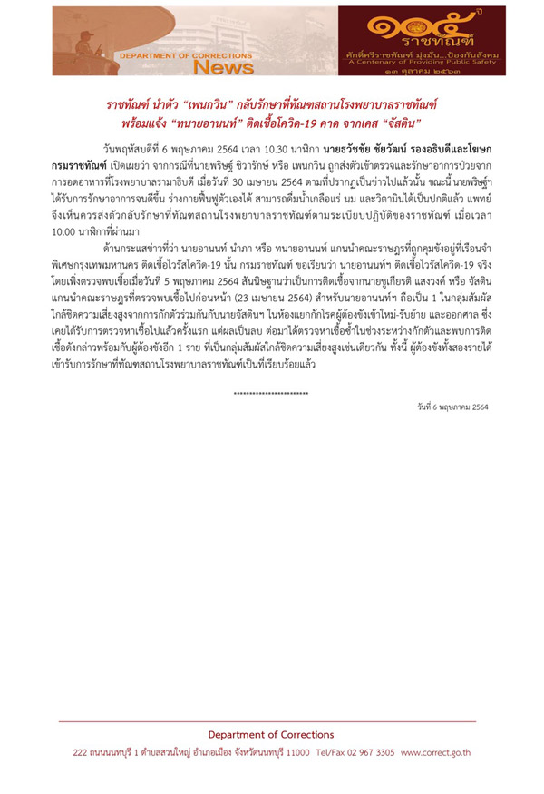 ด้านกระแสข่าวที่ระบุว่า นายอานนท์ นำภา หรือ ทนายอานนท์ แกนนำคณะราษฎรที่ถูกคุมขังอยู่ที่เรือนจำพิเศษกรุงเทพมหานคร ติดเชื้อไวรัสโควิด-19 นั้น กรมราชทัณฑ์ ขอเรียนว่า นายอานนท์ฯ ติดเชื้อไวรัสโควิด-19 จริง โดยเพิ่งตรวจพบเชื้อเมื่อวันที่ 5 พฤษภาคม 2564 สันนิษฐานว่าเป็นการติดเชื้อจากนายชูเกียรติ แสงวงค์ หรือ จัสติน แกนนำคณะราษฎรที่ตรวจพบเชื้อไปก่อนหน้า (23 เมษายน 2564) สำหรับนายอานนท์ฯ ถือเป็น 1 ในกลุ่มสัมผัสใกล้ชิดความเสี่ยงสูงจากการกักตัวร่วมกันกับนายจัสตินฯ ในห้องแยกกักโรคผู้ต้องขังเข้าใหม่-รับย้าย และออกศาล ซึ่งเคยได้รับการตรวจหาเชื้อไปแล้วครั้งแรก แต่ผลเป็นลบ ต่อมาได้ตรวจหาเชื้อซ้ำในช่วงระหว่างกักตัวและพบการติดเชื้อดังกล่าวพร้อมกับผู้ต้องขังอีก 1 ราย ที่เป็นกลุ่มสัมผัสใกล้ชิดความเสี่ยงสูงเช่นเดียวกัน ทั้งนี้ ผู้ต้องขังทั้งสองรายได้เข้ารับการรักษาที่ทัณฑสถานโรงพยาบาลราชทัณฑ์เป็นที่เรียบร้อยแล้ว