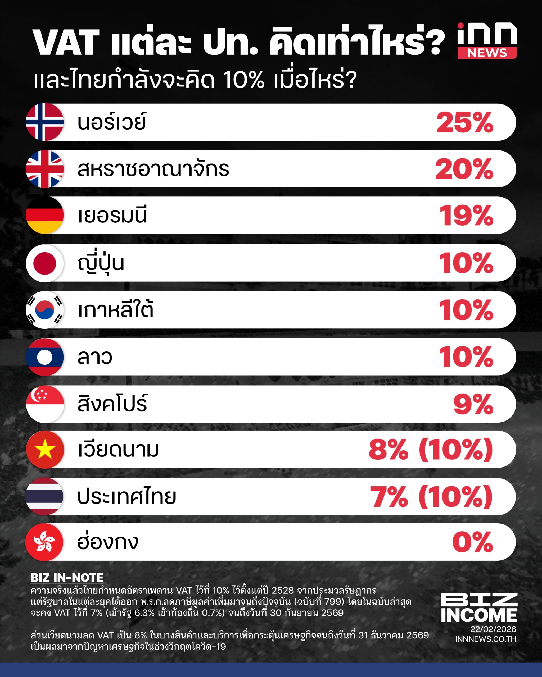 วันนี้ INN News จะพาไปเจาะลึกเรื่องราวของภาษีมูลค่าเพิ่ม (Value Added Tax) ที่ไม่ได้มีแค่ในบ้านเรา แต่เป็นกลไกการเก็บรายได้ของรัฐบาลทั่วโลก มาดูกันว่าต่างประเทศเขาเก็บกันโหดแค่ไหน แล้วไทยเราจะยื้อตัวเลข 7% นี้ไปได้อีกนานเท่าไหร่?