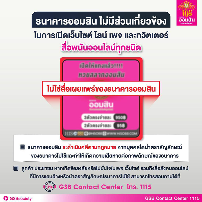 รายงานข่าวจากธนาคารออมสิน แจ้งว่า ด้วยขณะนี้มีผู้แอบอ้างชื่อธนาคารออมสิน และตราสัญลักษณ์ของธนาคาร รวมทั้งนำข้อความ “สลากออมสิน” ไปใช้ในการเปิดเว็บไซต์ ไลน์ เพจ ทวิตเตอร์ และสื่อสังคมออนไลน์ต่างๆ เพื่อเชิญชวนและหลอกลวงประชาชนให้เข้าสู่การพนันออนไลน์ นั้น ขอย้ำว่า ธนาคารไม่มีส่วนเกี่ยวข้อง และไม่ใช่สื่อเผยแพร่ของธนาคาร ซึ่งการกระทำดังกล่าว ส่งผลให้เกิดความเสียหายต่อภาพลักษณ์และชื่อเสียงของธนาคารออมสิน รวมทั้งยังเกิดความเสียหายต่อประชาชนที่อาจถูกหลอกลวงได้