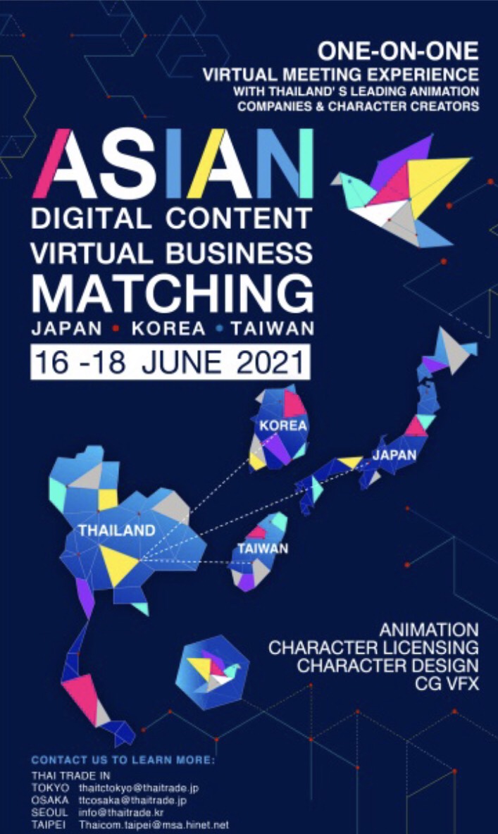 กรมฯจึงกำหนดดำเนินโครงการส่งเสริมธุรกิจดิจิทัลคอนเทนท์ไทยในประเทศญี่ปุ่น เกาหลีและไต้หวัน หรือ งาน ASIAN Digital Content Virtual Business Matching ระหว่างวันที่ 16 -18 มิถุนายน 2564 เพื่อส่งเสริมและสนับสนุนผู้ประกอบการไทยในการเจรจาธุรกิจออนไลน์กับผู้ประกอบการที่มีศักยภาพในญี่ปุ่น เกาหลีและไต้หวัน ซึ่งเป็นการรักษาตลาดหลักและขยายตลาดอุตสาหกรรมดิจิทัลคอนเทนท์ไทยในประเทศดังกล่าว ในช่วงสถานการณ์การแพร่ระบาดของโควิด-19 ที่ผู้ประกอบการไม่สามารถเดินทางระหว่างประเทศได้ โดยคาดว่าจะมีผู้ประกอบการในประเทศญี่ปุ่น เกาหลี และไต้หวัน จำนวนไม่ต่ำกว่า 30 ราย เข้าร่วมเจรจาธุรกิจออนไลน์กับผู้ประกอบการไทย จำนวน 20 ราย