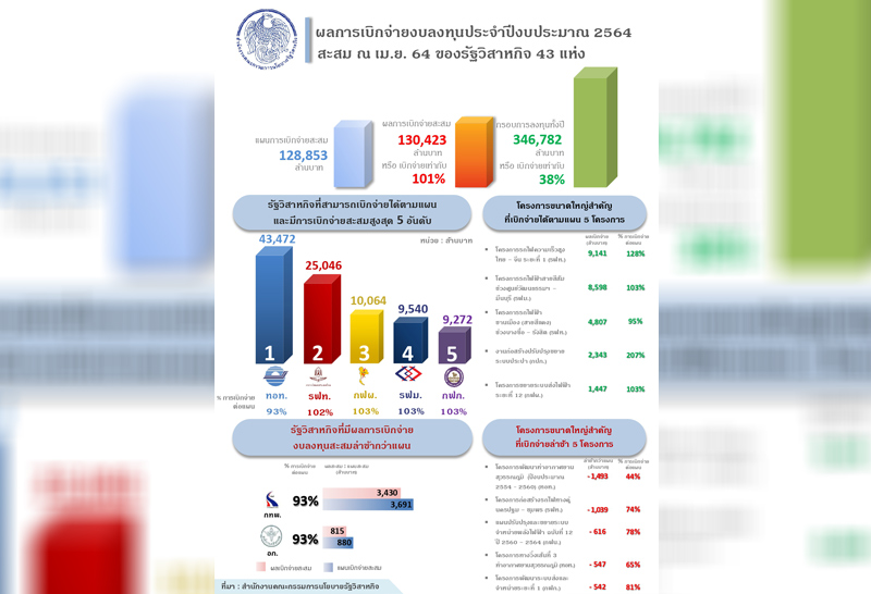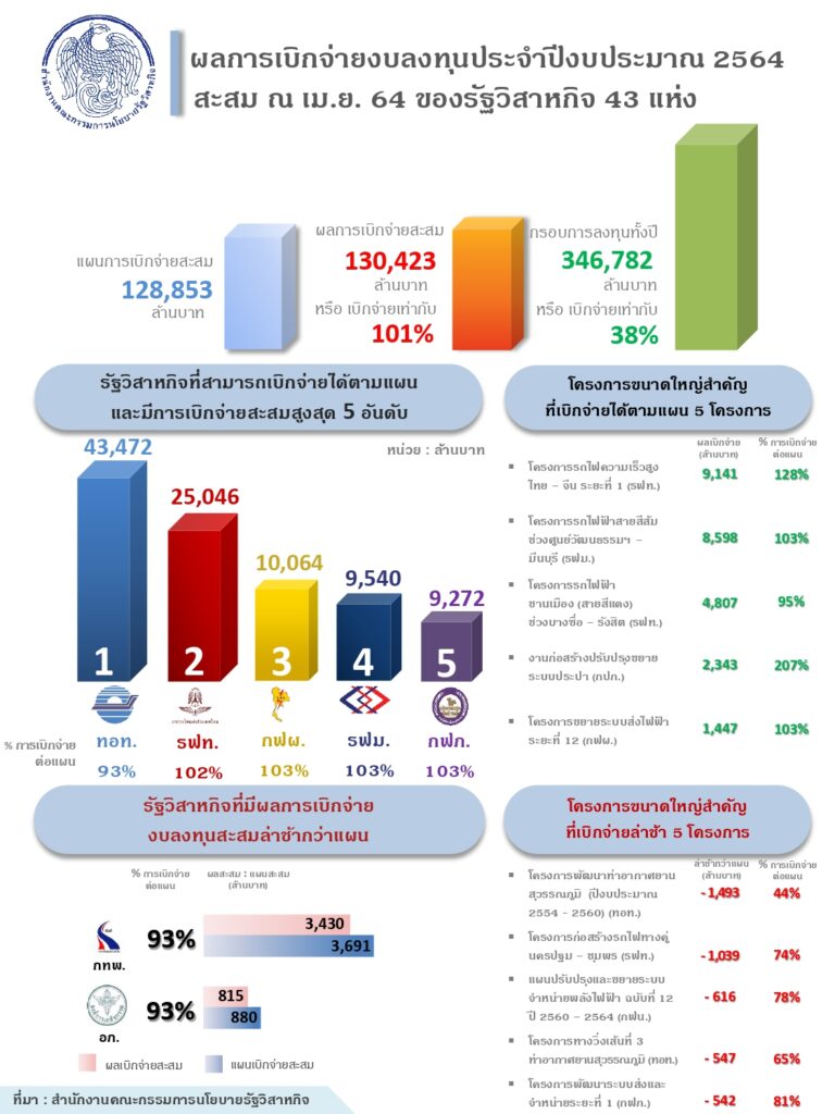 นางสาวปิยวรรณ ล่ามกิจจา ที่ปรึกษาด้านพัฒนารัฐวิสาหกิจ กล่าวเสริมว่า ณ สิ้นเดือนเมษายน 2564 รัฐวิสาหกิจหลายแห่งสามารถเบิกจ่ายได้เป็นไปตามแผนหรือสูงกว่าแผน เช่น การรถไฟแห่งประเทศไทย (รฟท.) การรถไฟฟ้าขนส่งมวลชนแห่งประเทศไทย (รฟม.) การไฟฟ้าฝ่ายผลิตแห่งประเทศไทย และการไฟฟ้าส่วนภูมิภาค (กฟภ.) โดยมีโครงการลงทุนขนาดใหญ่ที่สามารถเบิกจ่ายได้สูงกว่าแผน อาทิ โครงการรถไฟฟ้าสายสีส้มช่วงศูนย์วัฒนธรรมฯ – มีนบุรี ของ รฟม. โครงการรถไฟความเร็วสูงไทย – จีน ระยะที่ 1 (ช่วงกรุงเทพมหานคร – นครราชสีมา) และโครงการรถไฟฟ้าชานเมือง (สายสีแดง) ช่วงบางซื่อ – รังสิต ของ รฟท. งานก่อสร้างปรับปรุงขยายระบบประปาของการประปาส่วนภูมิภาค และโครงการขยายระบบส่งไฟฟ้าระยะที่ 12 ของการไฟฟ้าฝ่ายผลิตแห่งประเทศไทย ทั้งนี้ มีโครงการลงทุนขนาดใหญ่ที่เบิกจ่ายล่าช้า เช่น โครงการพัฒนาท่าอากาศยานสุวรรณภูมิ (ปีงบประมาณ 2554 – 2560) และโครงการทางวิ่งเส้นที่ 3 ท่าอากาศยานสุวรรณภูมิ ของบริษัท ท่าอากาศยานไทย จำกัด (มหาชน) โครงการก่อสร้างรถไฟทางคู่ ช่วงนครปฐม – ชุมพร ของ รฟท. โครงการแผนปรับปรุงและขยายระบบจำหน่ายพลังไฟฟ้า ฉบับที่ 12 ปี 2560 – 2564 ของการไฟฟ้านครหลวง และโครงการพัฒนาระบบส่งและจำหน่ายระยะที่ 1 ของ กฟภ.